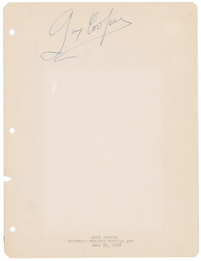 Vintage ballpoint signature, “Gary Cooper,” on an off-white 8.5 x 11 album page. Typed collector’s notation at the bottom reads, “Gary Cooper, Biltmore Theatre ‘Stalag 17’ June 23, 1952.” Punch holes to left edge, a few spaces of scattered surface loss, and some mild toning, otherwise fine condition. Accompanied by a 5 x 8.5 laser copy promotional image of Cooper in Sergeant York.