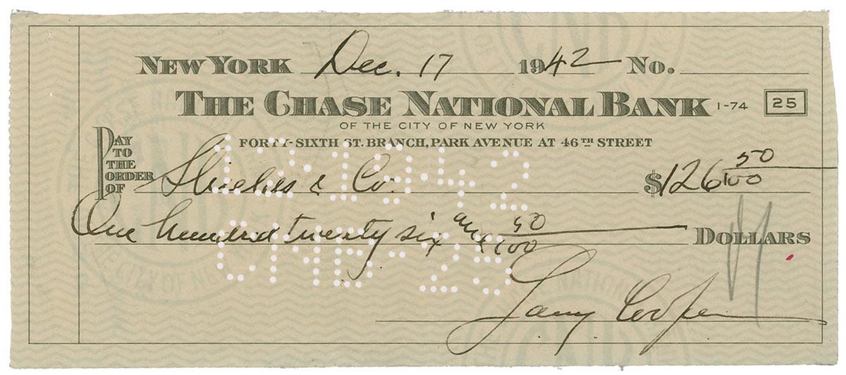 Bank check, 6.25 x 2.75, filled out and signed by Cooper, payable to Shields and Co. for $126.50, December 17, 1942. Trimmed right edge, a central vertical fold, staple hole to left edge, pencil cancellation next to signature, and expected cancellation holes and stamps, otherwise fine condition.