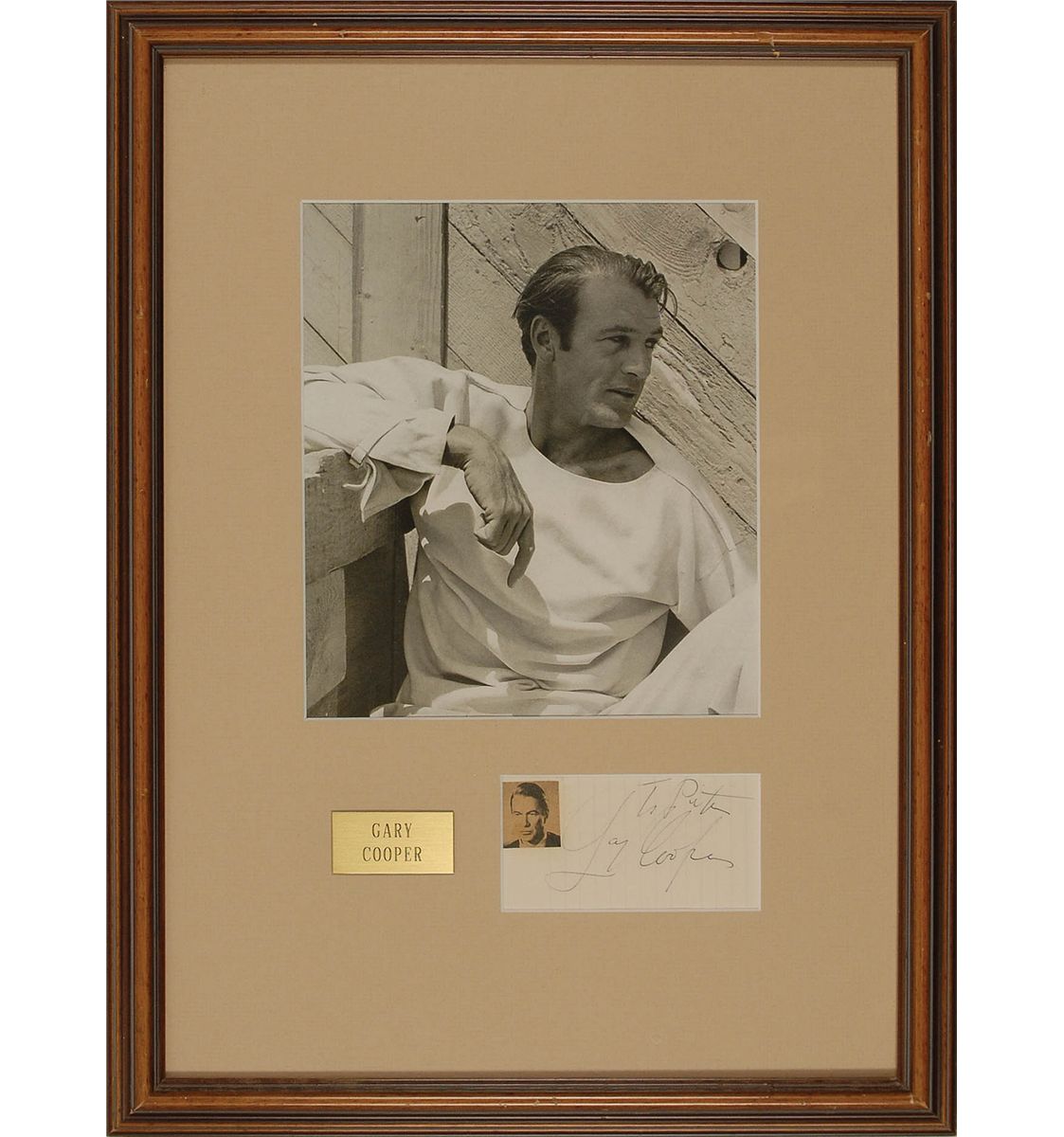 Vintage ballpoint signature and inscription, “To Peter, Gary Cooper,” on an off-white 4.25 x 2.25 lightly-lined sheet with a magazine photo of Cooper affixed to the left side. Matted and framed with a nameplate and photo of Cooper to an overall size of 14 x 19. In fine condition, with slight skipping to ink in the signature.