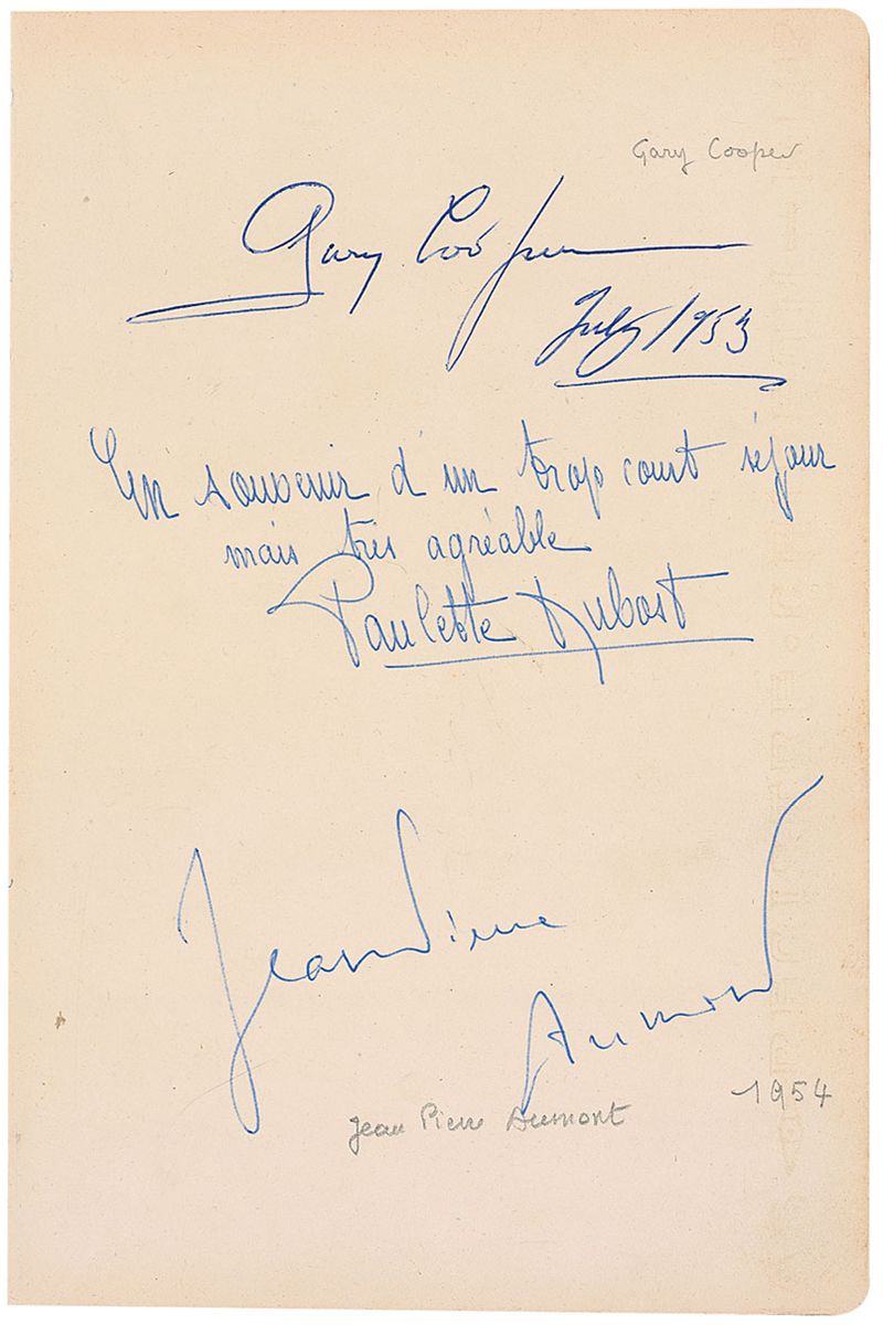 Vintage ballpoint signature, “Gary Cooper July 1953,” on an off-white 6.25 x 9.5 guest book page, which is also signed by Jean Pierre Aumont and Paulette Dubost, with collector’s pencil notations next to the signatures. In fine condition.