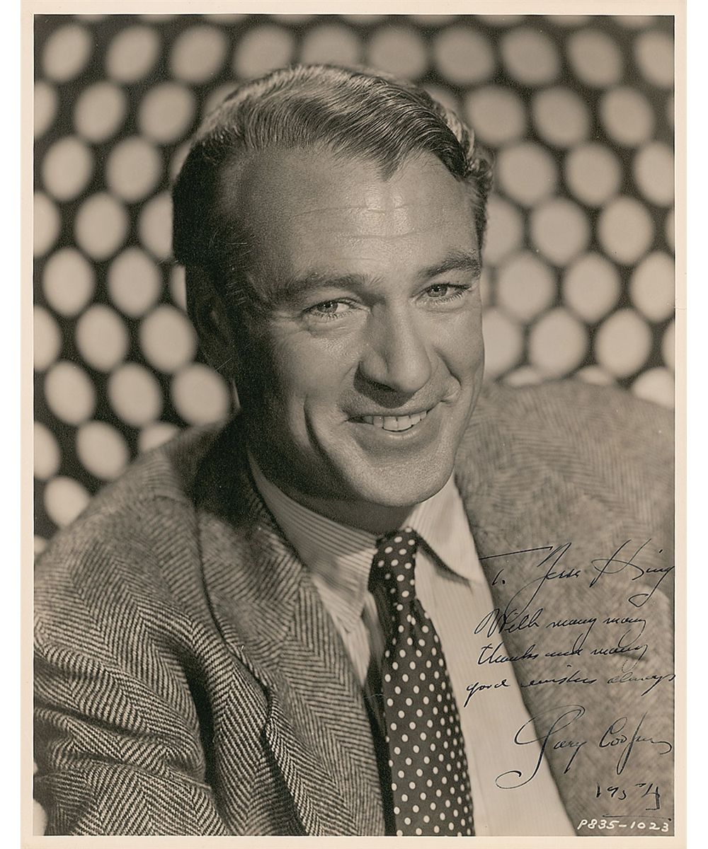 Handsome vintage matte-finish 11 x 14 photo, signed and inscribed in fountain pen, “To Jesse King, With many many thanks and many good wishes always, Gary Cooper, 1954.” In fine condition.