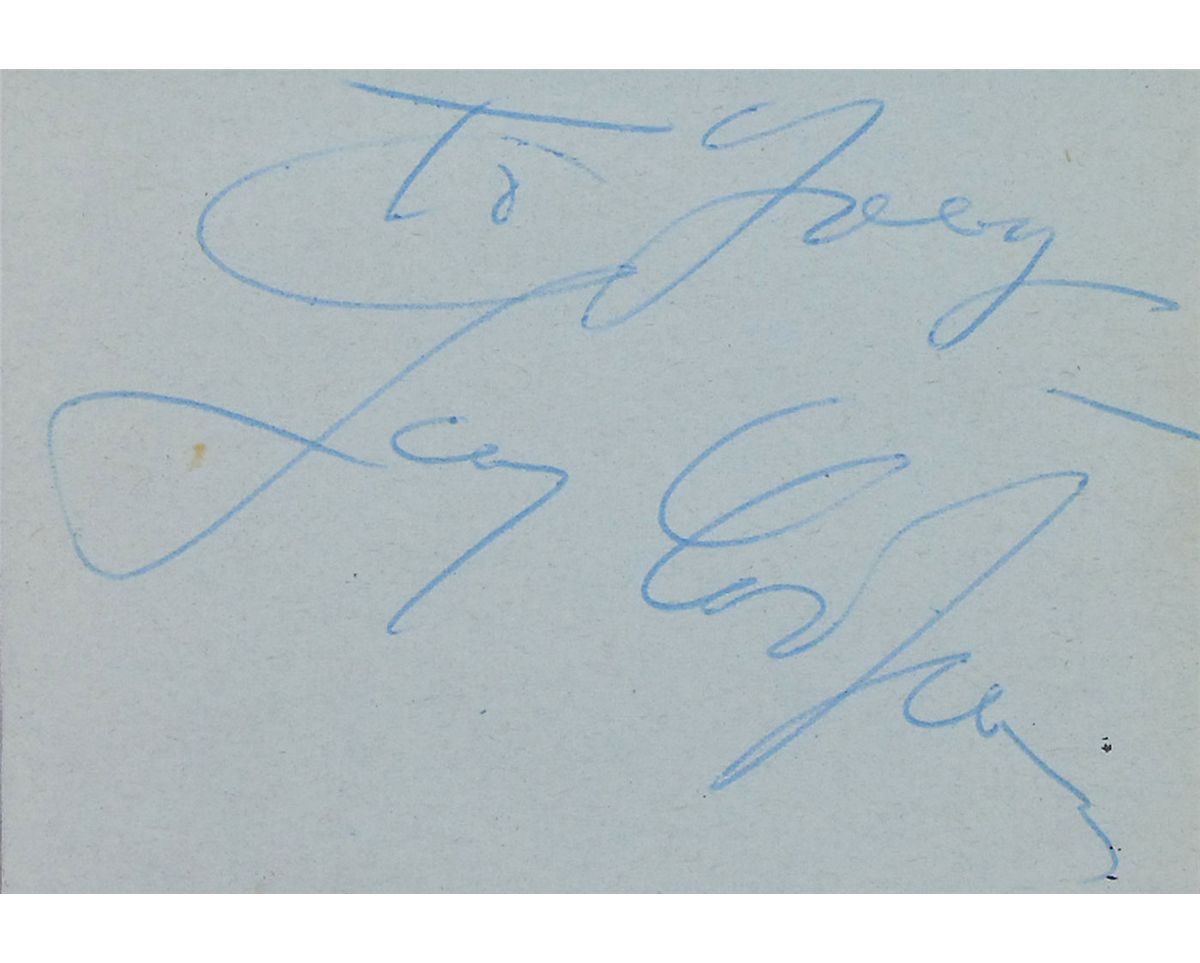 Vintage fountain pen signature and inscription, “To Joey, Gary Cooper,” on a light blue album page. Double-matted with two photos of Cooper from High Noon and Pride of the Yankees to an overall size of 20 x 16. In fine condition.