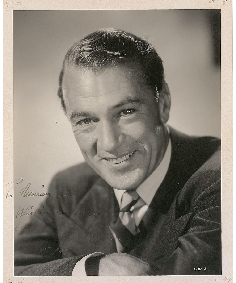 Handsome vintage matte-finish 8 x 10 photo, signed and inscribed in fountain pen, “To Marion, Wishing you all the best, Gary Cooper.” In very good condition, with tack holes to each corner, mild edge rippling, a bit of scattered surface loss to signature and inscription from pen, and poor contrast to signature and portion of inscription.