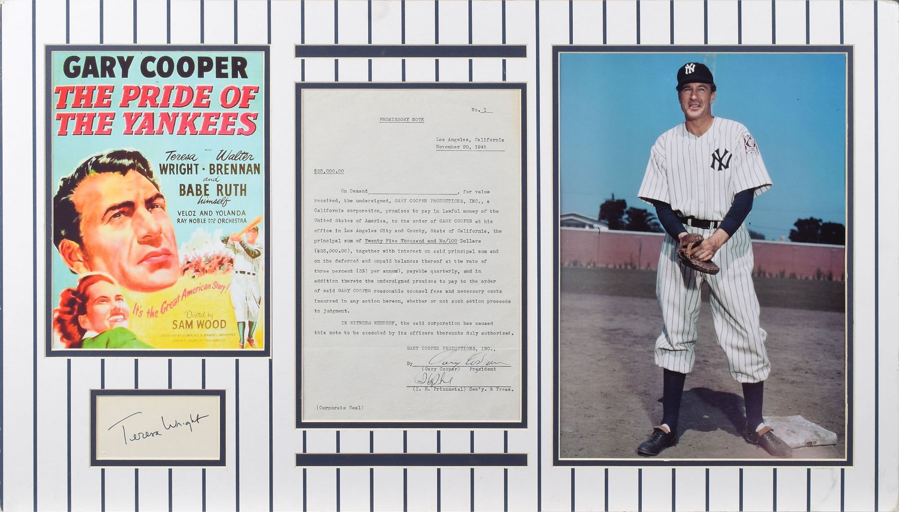 DS, one page, 7.25 x 11, November 20, 1945. Promissory note in which Gary Cooper Productions "promises to pay in lawful money of the United States of America, to the order of Gary Cooper…the principal sum of Twenty Five Thousand and No/100 Dollars." Signed at the conclusion in fountain pen by Cooper. Double-matted with image of the poster for the 1942 film The Pride of the Yankees, a photo of Cooper as Lou Gehrig from the film, and an ink signature of actress Teresa Wright to an overall size of 30 x 17. In fine condition. Accompanied by a full letter of authenticity from PSA/DNA.