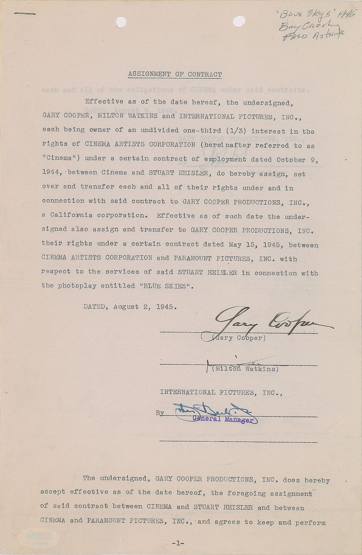 DS, one page, 8.5 x 13, August 2, 1945. The first page of an assignment of contract, which states that Gary Cooper, Milton Watkins, and International Pictures, Inc., "each being owner of an undivided one-third (1/3) interest in the rights of Cinema Artists Corporation…do hereby assign, set over and transfer each and all of their rights…to Gary Cooper Productions…in connection with the photoplay entitled 'Blue Skies.'" Signed at the conclusion in fountain pen by Cooper. In fine condition. Accompanied by a full letter of authenticity from PSA/DNA.