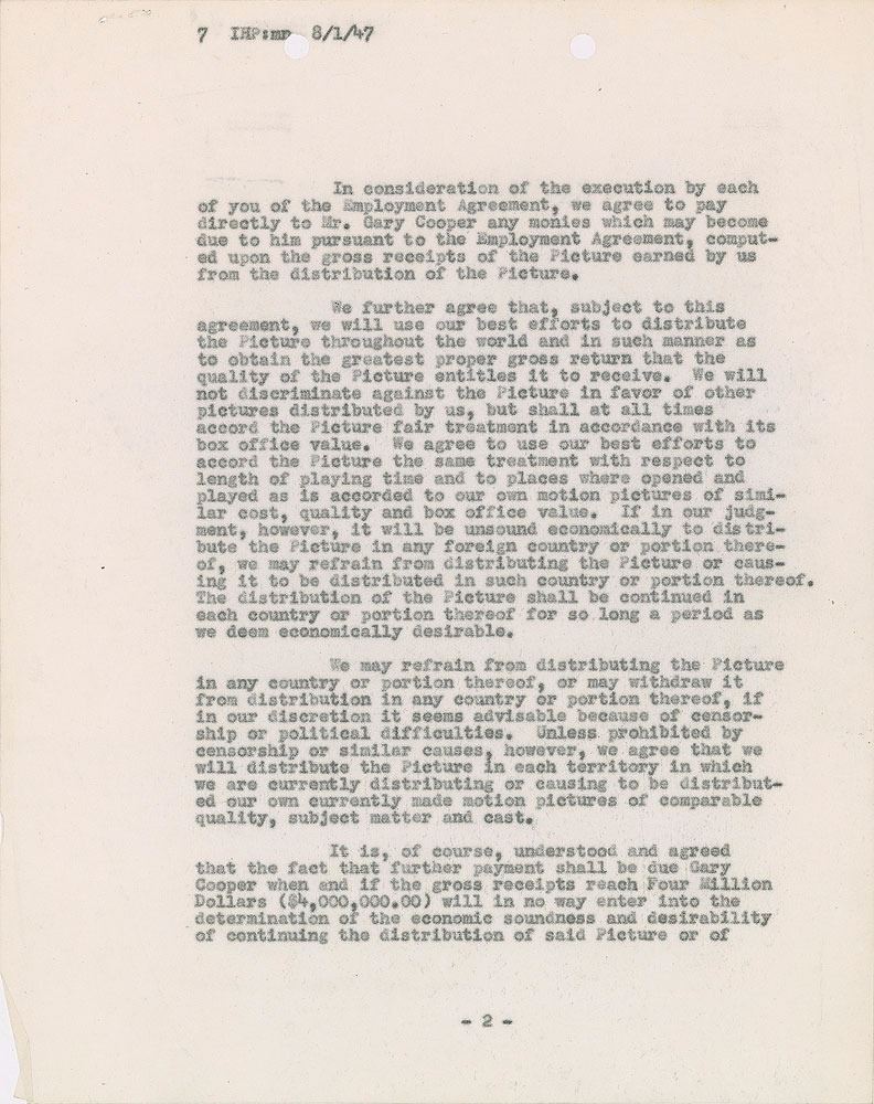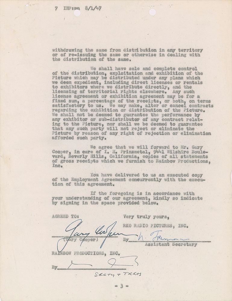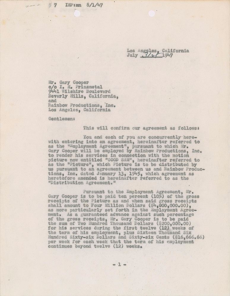DS, three pages, 8.5 x 11, July 31, 1947. Employment agreement between RKO Radio Pictures, Rainbow Productions, and Gary Cooper, in which the actor "will be employed…to render his services in connection with the motion picture now entitled 'Good Sam'" for which he will "be paid the sum of Two Hundred Thousand Dollars…for his services during the first twelve (12) weeks." Signed at the conclusion in fountain pen by Cooper. In fine condition.
