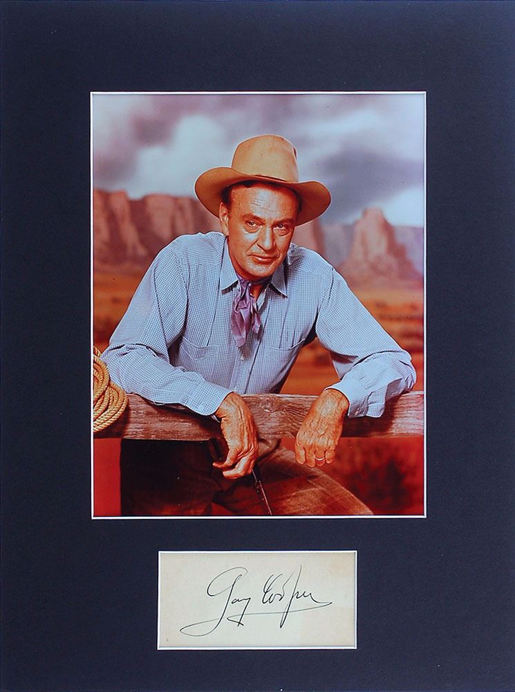 Ink signature, "Gary Cooper," on an off-white 4.5 x 2.25 album page. Matted with a photo of Cooper in classic Western attire to an overall size of 12 x 16. In fine condition, with trivial soiling and an irregular block of toning to lower right touching the paraph.
