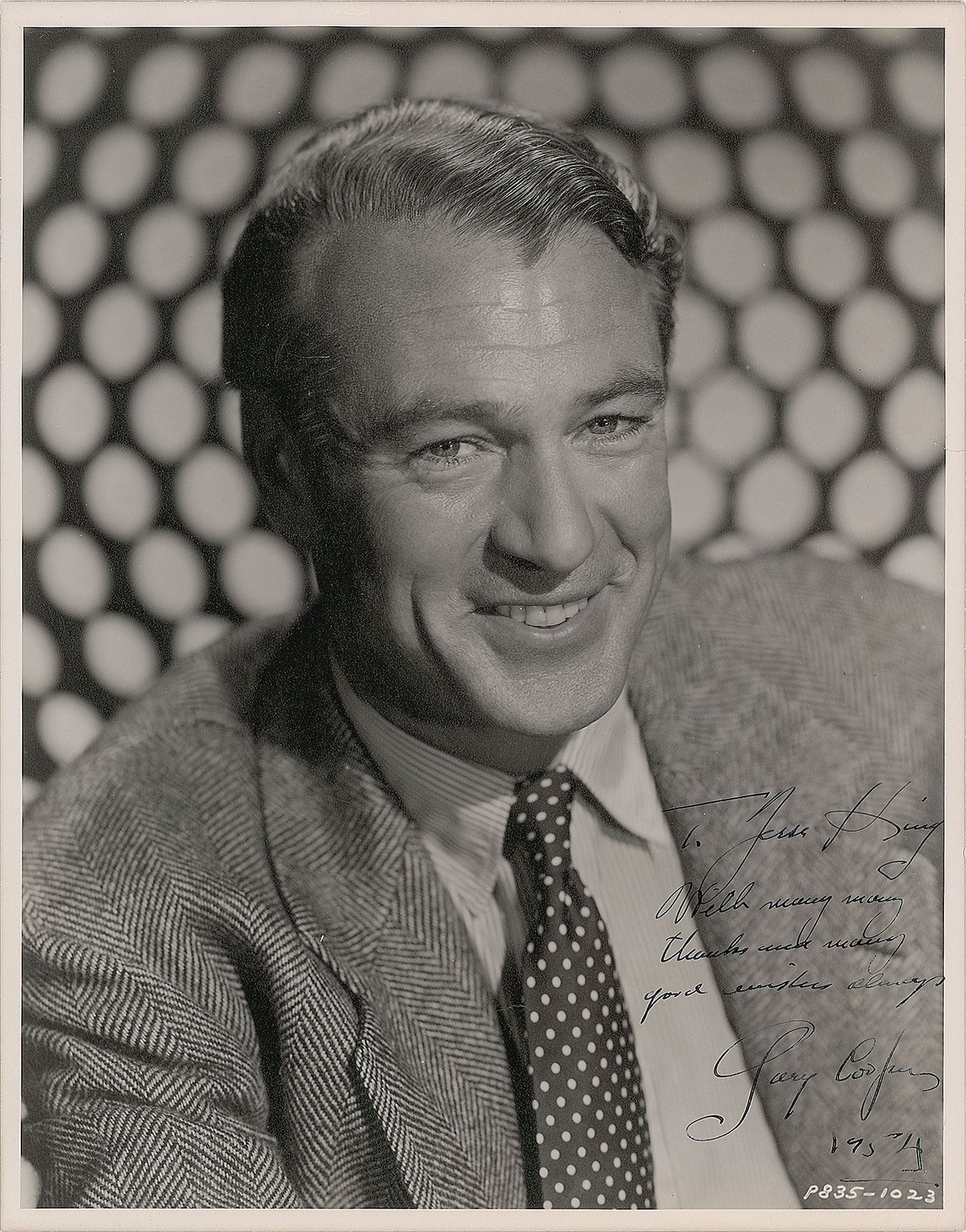 Handsome vintage matte-finish 11 x 14 photo of Cooper in a suit and tie, signed and inscribed in fountain pen, "To Jesse King, With many many thanks and many good wishes always, Gary Cooper, 1954.” In fine condition, with a small tear to the right edge.