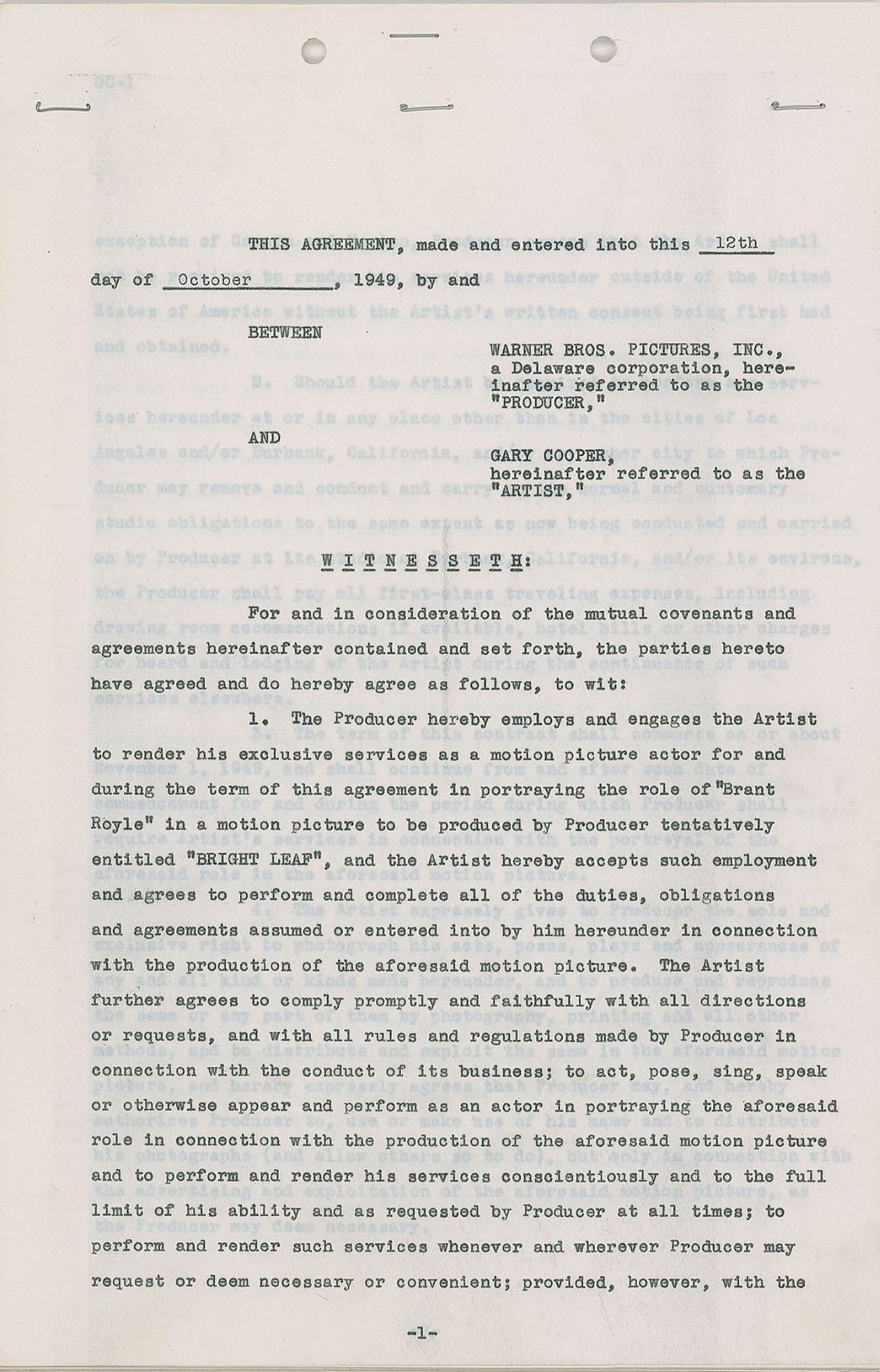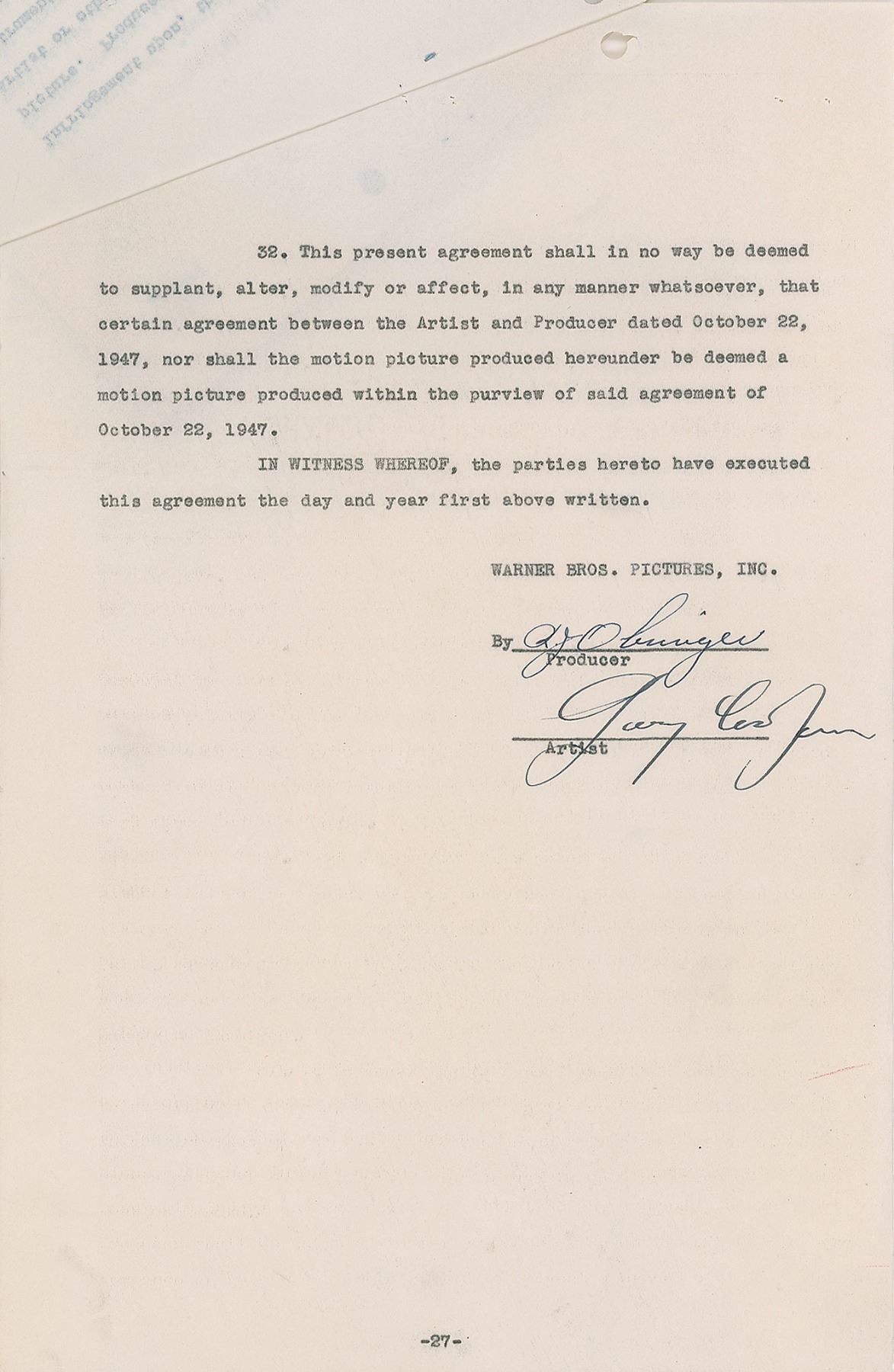 DS, 27 pages, 8.5 x 13, October 12, 1949. Contract between Warner Bros. Pictures and Gary Cooper, in which the ladder agrees to "render his exclusive services as a motion picture actor for and during the term of this agreement in portraying the role of 'Brant Royale' in a motion picture…tentatively entitled 'Bright Leaf.'" Signed at the conclusion in fountain pen by Cooper. In fine condition, with a few fingerprints to the ninth page.