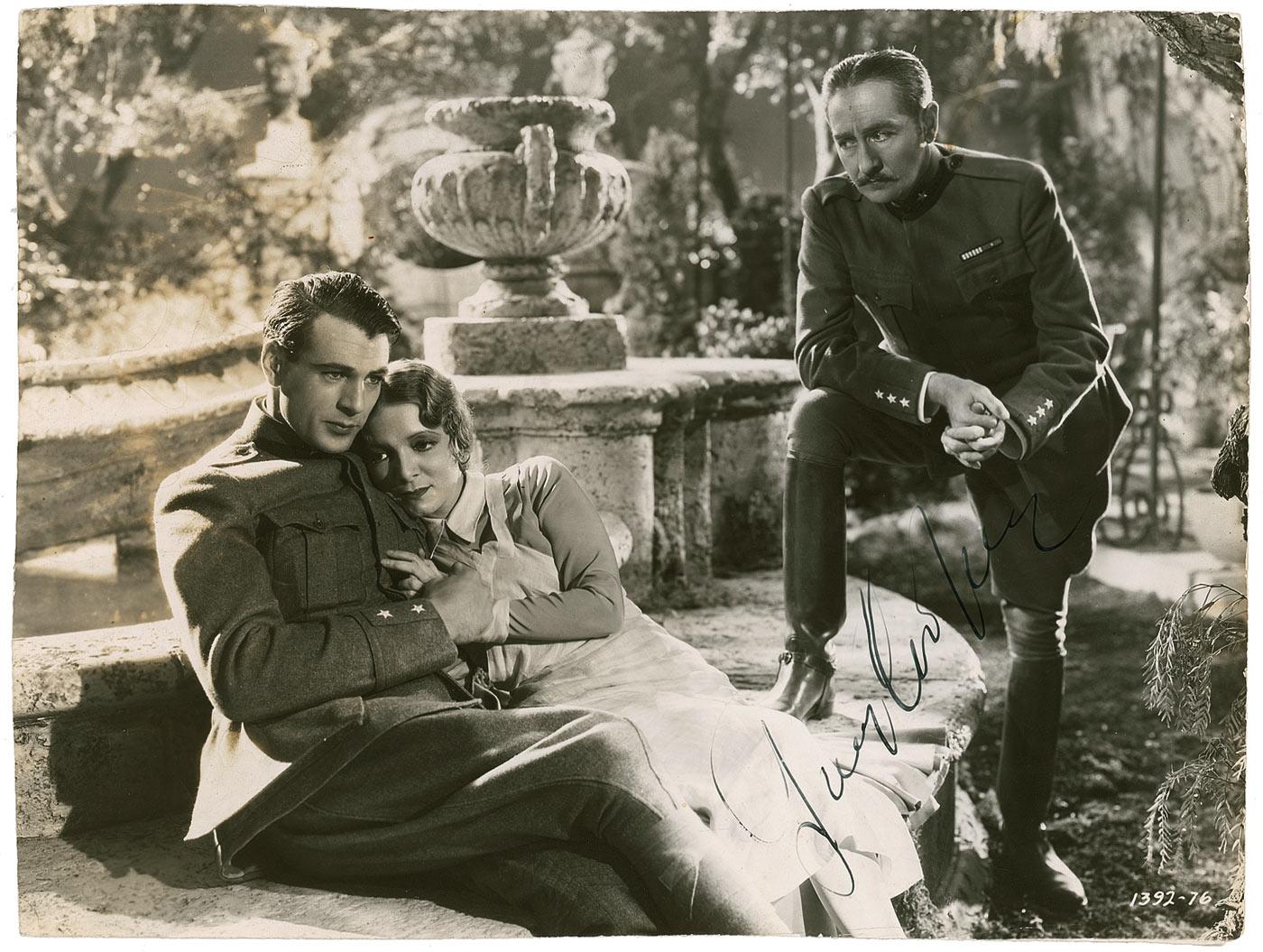 Vintage glossy 9.25 x 7 photo from A Farewell to Arms, signed in black fountain pen. Surface creasing and rippling, trimmed edges, areas of chipping, moderate contrast to the signature, and some light toning and emulsion irregularities to the left half of the photo, otherwise very good condition. Extremely scarce in signed photos from his classic Hemingway film. Pre-certified PSA/DNA and RRAuction COA.