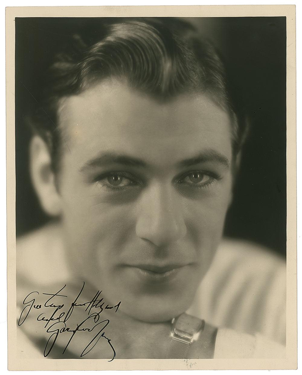 Vintage matte-finish 8 x 10 close-up photo of Cooper resting his chin on his hand, signed in fountain pen, “Greetings from Hollywood and Gary Cooper.” In fine condition, with some mild rippling to horizontal edges, and just a bit of light toning to bottom, not affecting the very nice signature.