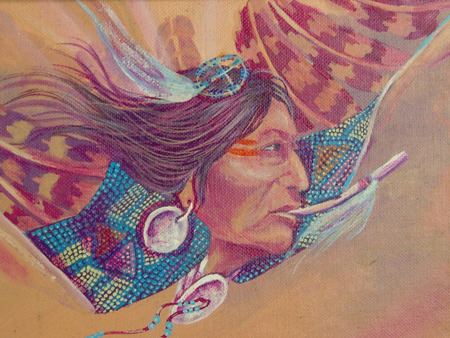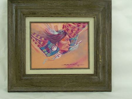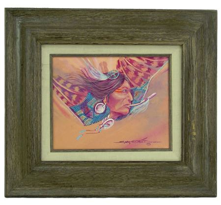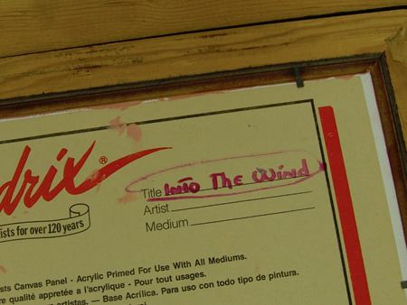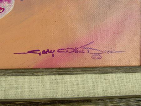 Ca. 1980s, Signed original oil on canvas board - "Into the Wind" - depicting a colorful subject with a bird flute in its mouth. Let us know if you recognize the artist's name please! Very good condition. 7-1/2" x 9-1/2" (15" x 17-1/2" framed)