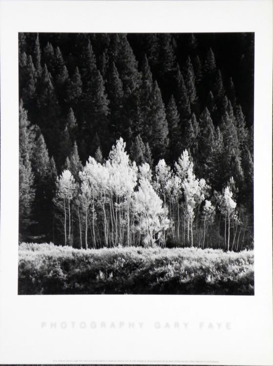 This photo poster shows a nice contrast of tall dark pines and aspen trees in the light. * Artist: Gary Faye Title: Aspens * Medium: Lithograph on paperSheet size: 20 x 16 inchesCondition: Excellent * Publisher: Wizard & Genius-IdealdecorDate: 1999Printed in Switzerland