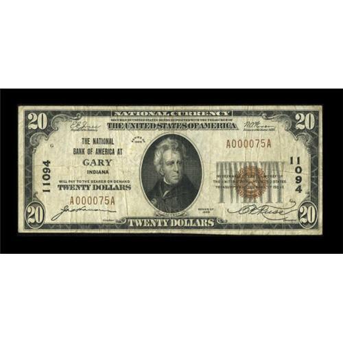 <B>Gary, IN</B></I> - $20 1929 Ty. 1 <B>The NB of America at Gary</B></I> Ch. # 11094<BR> One of ten small size notes from this institution which departed in 1932. <B>Very Good</B></I>.<BR><I>From The Kansas City Collection.</B></I><BR><BR><b>Shipping:</b> Coins & Currency (<a target="_blank" href="http://www.heritageauctions.com/common/shipping.php">view shipping information</a>)