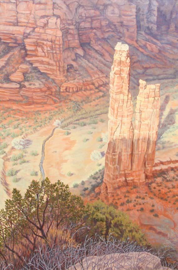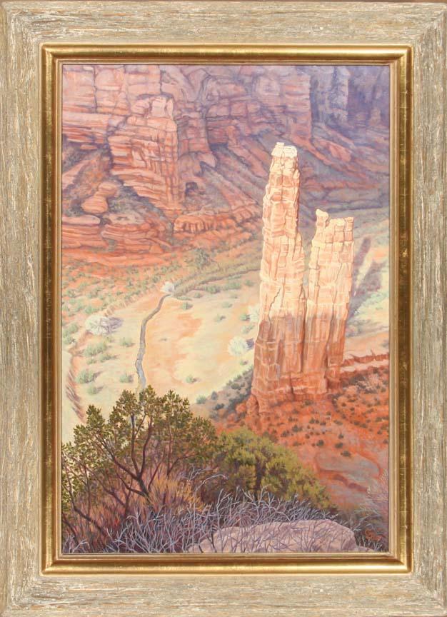 Gary R. Johnson (b.1953). Spider Rock, Arizona, 2007. 30" x 20" oil on linen. Signed lower right. Custom-made frame, hand carved & gold leafed by Artist Built Frames, Bozeman, MT. (est $3,500-4,500). Additional info: Spider Rock is named for the Navajo myth of "Spider Woman" who lives at the top. For condition reports please visit: www.auctioninsantafe.com/cr2011.pdf