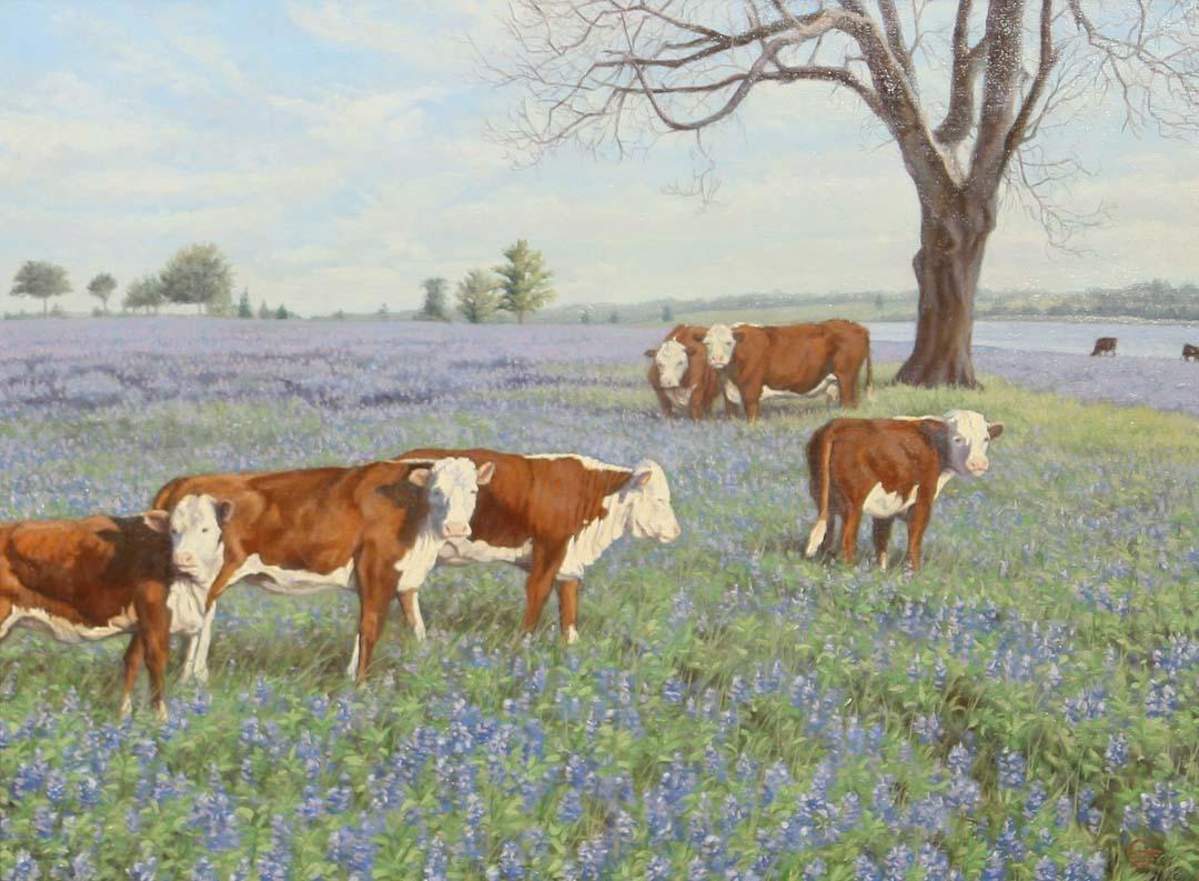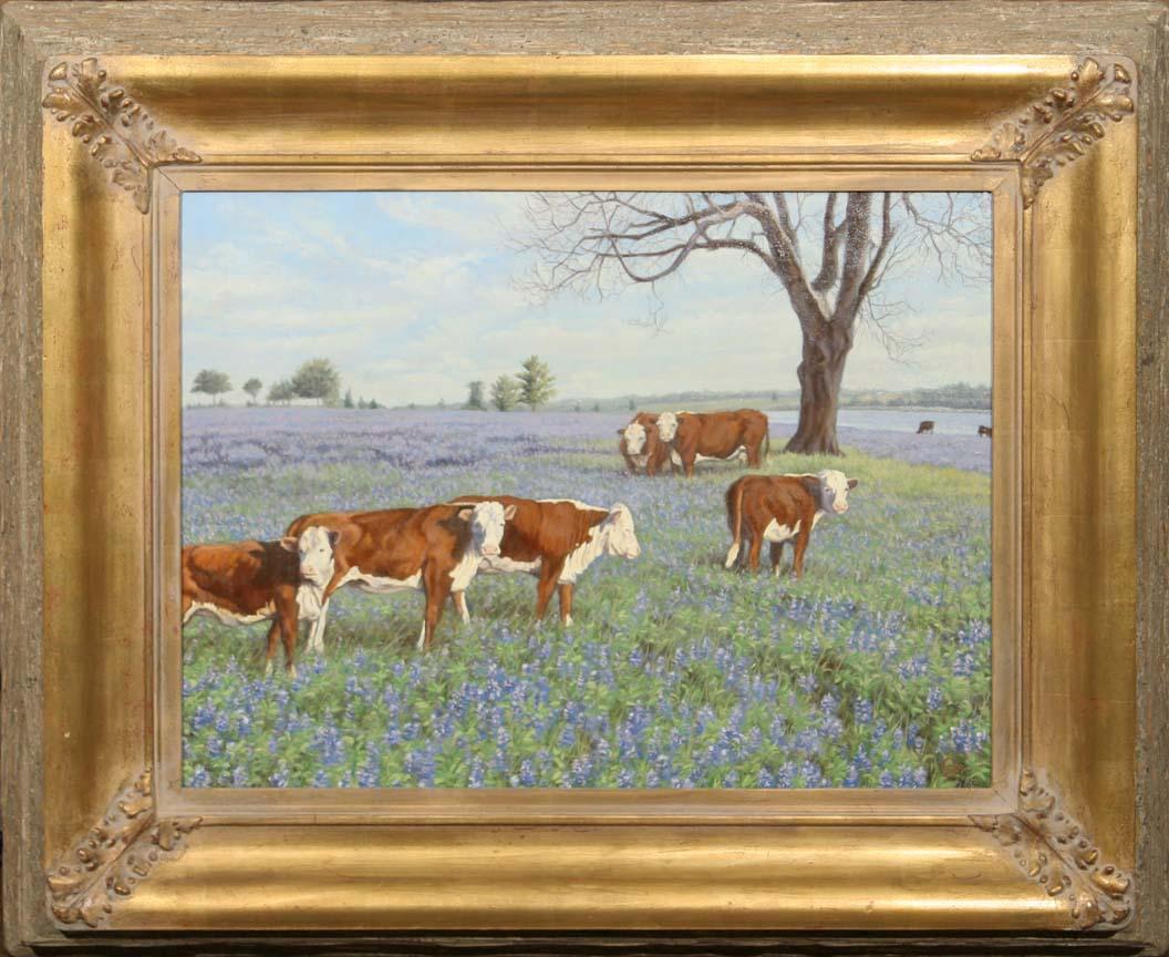 Gary R. Johnson (b.1953). Herefords & Bluebonnets. 18" x 24" oil on linen. Signed lower right. Custom-made frame, hand carved & gold leafed by Artist Built Frames, Bozeman, MT. (est $2,500-3,500). For condition reports please visit: www.auctioninsantafe.com/cr2011.pdf