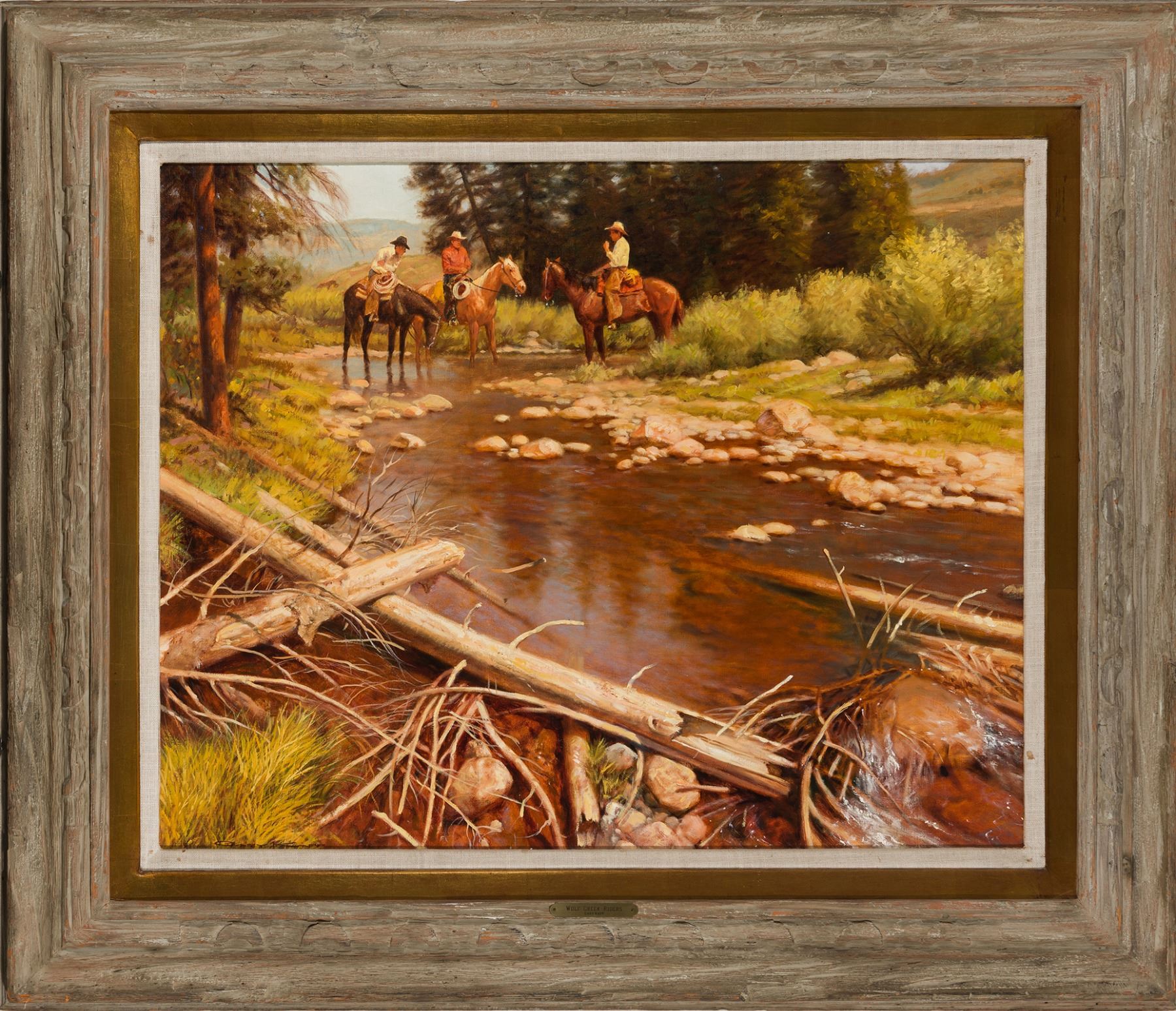 Condition details: This painting is in very good condition. With the unaided eye there are no issues. Closer inspection under ultraviolet light reveals normal fluorescence of artist's pigments, and no signs of restoration. The piece is framed in a rustic grey frame with gold trim and a cream linen lining. The frame is in very good condition with normal wear. Goldplate: Wolf Creek Riders, Gary Kapp