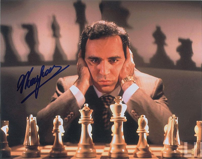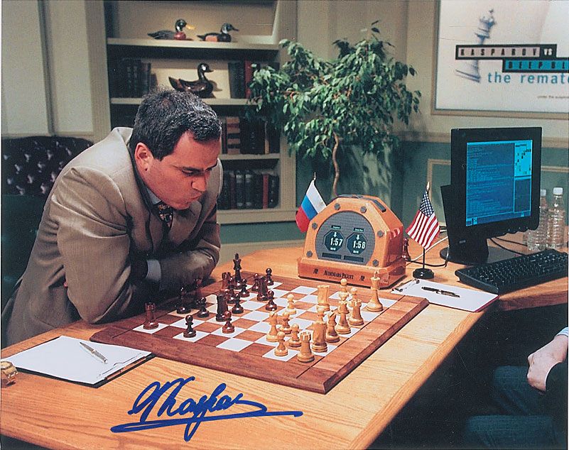 Two different color satin-finish 10 x 8 photos of Kasparov at the chess table, including one against Deep Blue, each signed in blue felt tip. In very fine condition.