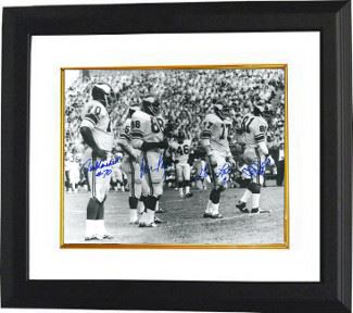 The Purple People Eaters was the nickname of the Minnesota Vikings football team's defensive line of the late 1960s to the late 1970s, when the Vikings played in four Super Bowls. The Purple People Eaters are Alan Page (9 Pro Bowl Selections, NFL MVP, and Hall of Famer), Carl Eller (6 Pro Bowl Selections and Hall of Famer), Jim Marshall (2 Pro Bowl Selections), and Gary Larsen (2 Pro Bowl Selections) The Purple People Eaters were a big factor in the post-season success of the Vikings from the late 1960s through the 1970s. This Minnesota Vikings 16X20 photo was hand signed by the Purple People Eaters: Carl Eller (with HOF 04 inscription), Alan Page, Jim Marshall, and Gary Larsen. Certificate of Authenticity from Athlon Sports. Custom White Mat and Black Color Framed as shown.
