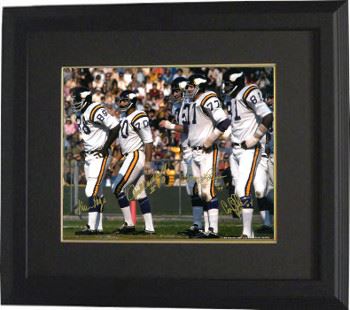 The Purple People Eaters was the nickname of the Minnesota Vikings football team's defensive line of the late 1960s to the late 1970s, when the Vikings played in four Super Bowls. The Purple People Eaters are Alan Page (9 Pro Bowl Selections, NFL MVP, and Hall of Famer), Carl Eller (6 Pro Bowl Selections and Hall of Famer), Jim Marshall (2 Pro Bowl Selections), and Gary Larsen (2 Pro Bowl Selections) The Purple People Eaters were a big factor in the post-season success of the Vikings from the late 1960s through the 1970s. This Minnesota Vikings 16X20 photo was hand signed by the Purple People Eaters: Carl Eller with HOF insc, Alan Page, Jim Marshall, and Gary Larsen. Photo of the Signing and Certificate of Authenticity from Athlon Sports. Custom Black Mat and Premium Black Frame as shown.