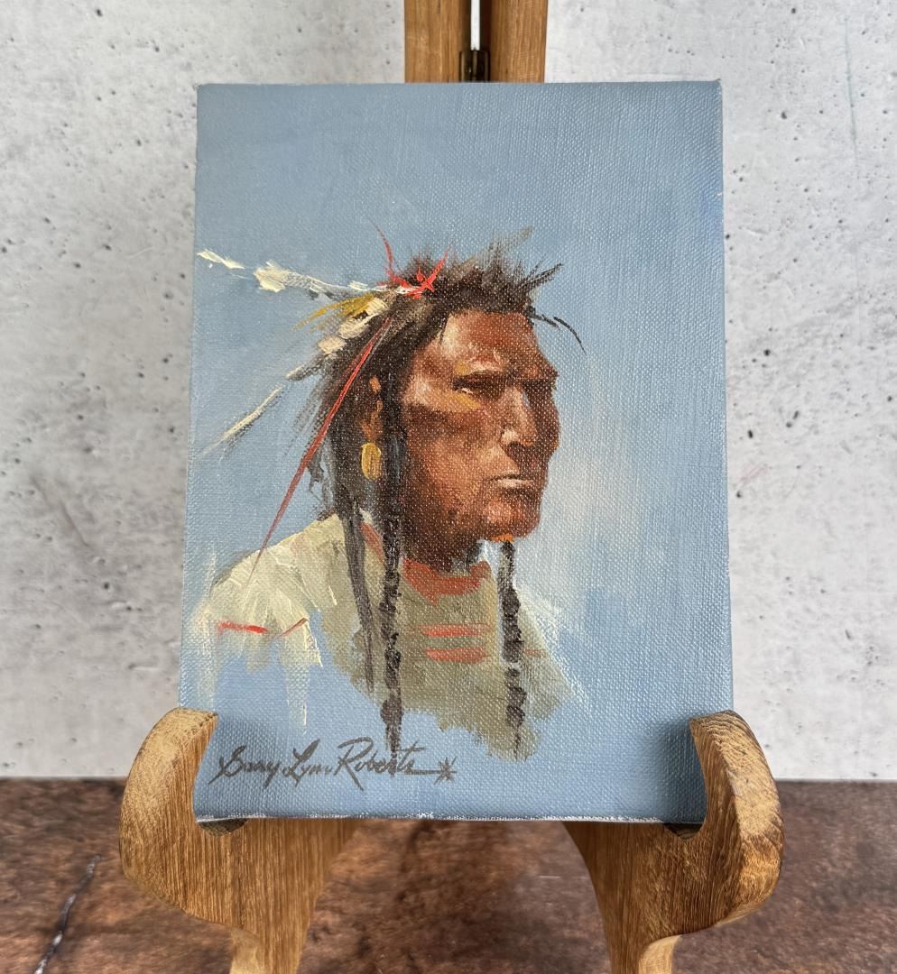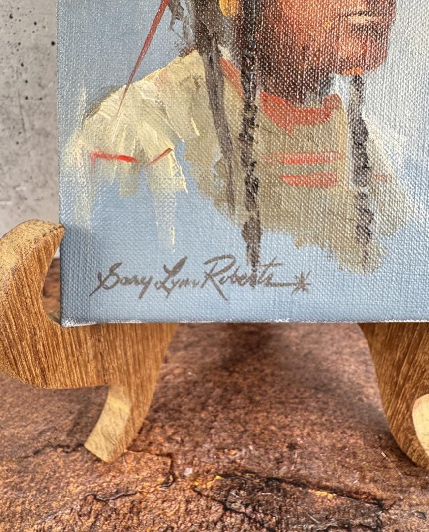 Title is War Chief. Oil on Canvas. 5 1/4" by 7 1/4". Gary Lynn Roberts (Born 1953) is active/lives in Texas, Montana. Gary Roberts is known for Historical, rangeland genre painting. The son of noted Western artist Joe Rader Roberts, Gary Lynn Roberts grew up surrounded by art. "I was fortunate to grow up in that atmosphere" he says. "In addition to my father, I received one on one training from many of his friends such as G. Harvey and A.D. Greer to mention only a couple. Many of my trainers were some of the Nation's most notable artists". The desire to capture history on canvas by totally researching the event depicted has made Gary Lynn one of America's most sought after historical print artists. Gary Lynn says "I want to do more than create a historically correct scene; I want to tell a story. When someone views one of my paintings, I want them to feel like they are part of the painting. " Gary Lynn lives with his wife Nancy and four children in Austin, Texas.