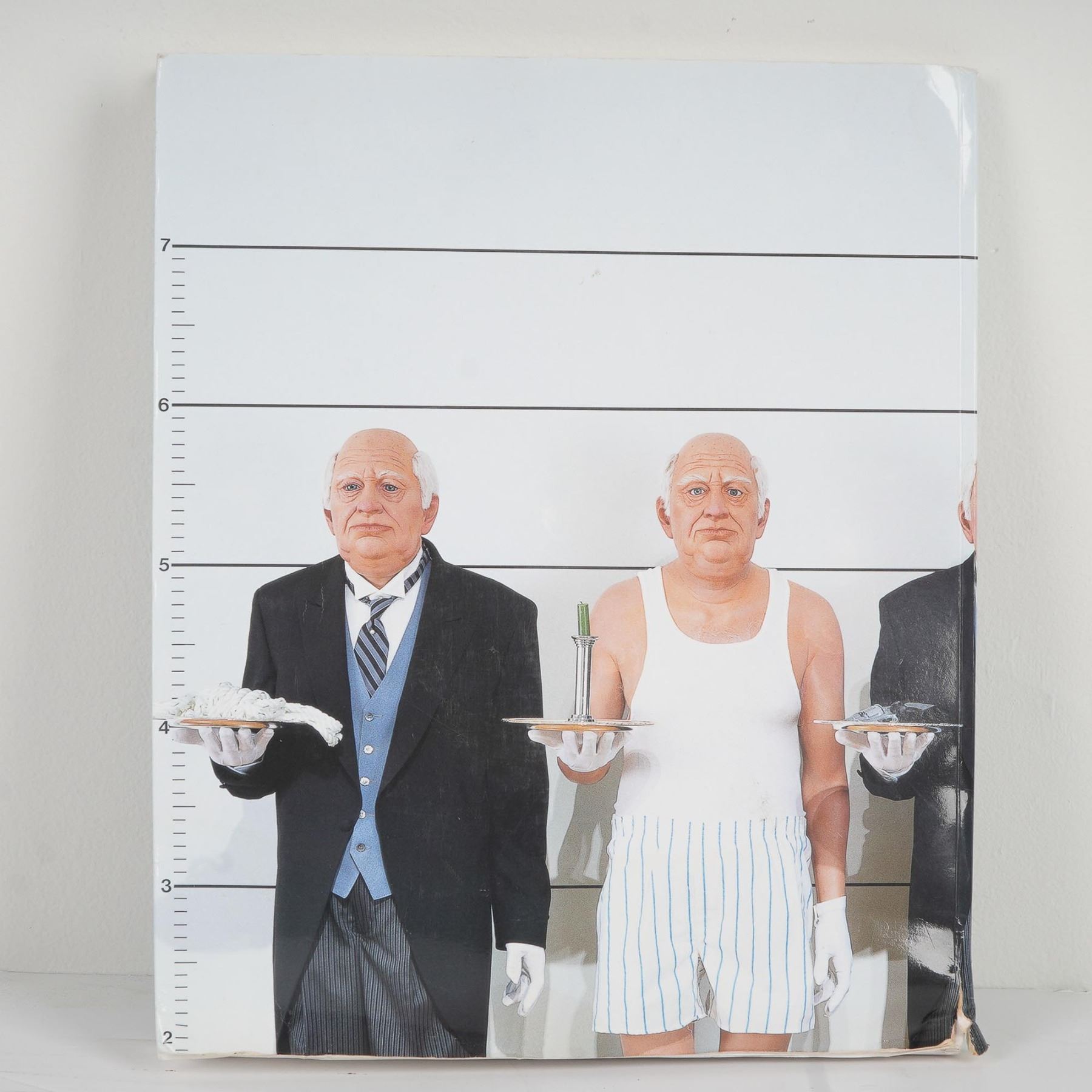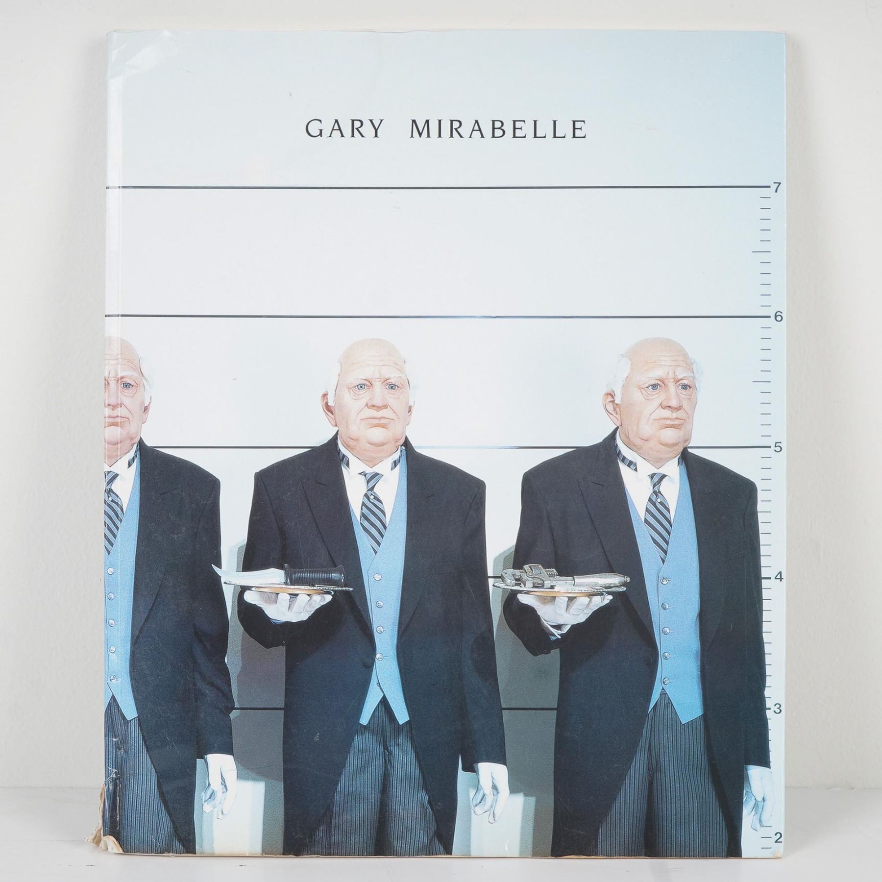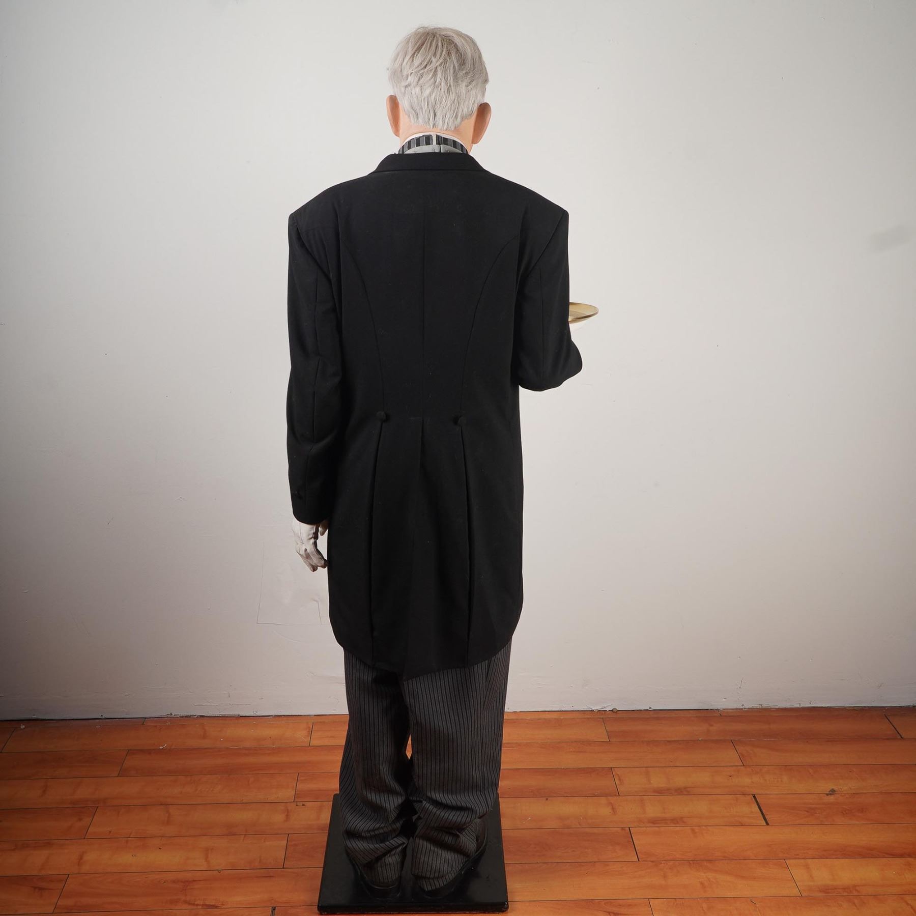 A striking life-size butler sculpture by Gary Mirabelle, numbered 145 of 180 and signed on the left hand. This unique piece captures a humorous yet detailed representation, dressed in a black suit with a striped tie and white gloves. Known for his whimsical and surreal figures, Mirabelle’s works are highly collectible. While not animated, this sculpture is anatomically correct and stands on a sturdy black base. Included in this lot are two brass platters, each measuring 10.25"diameter and a booklet detailing the artist and his lifelike creations. A rare and conversation-starting display piece. Signature on the hand. Measures 69"H.