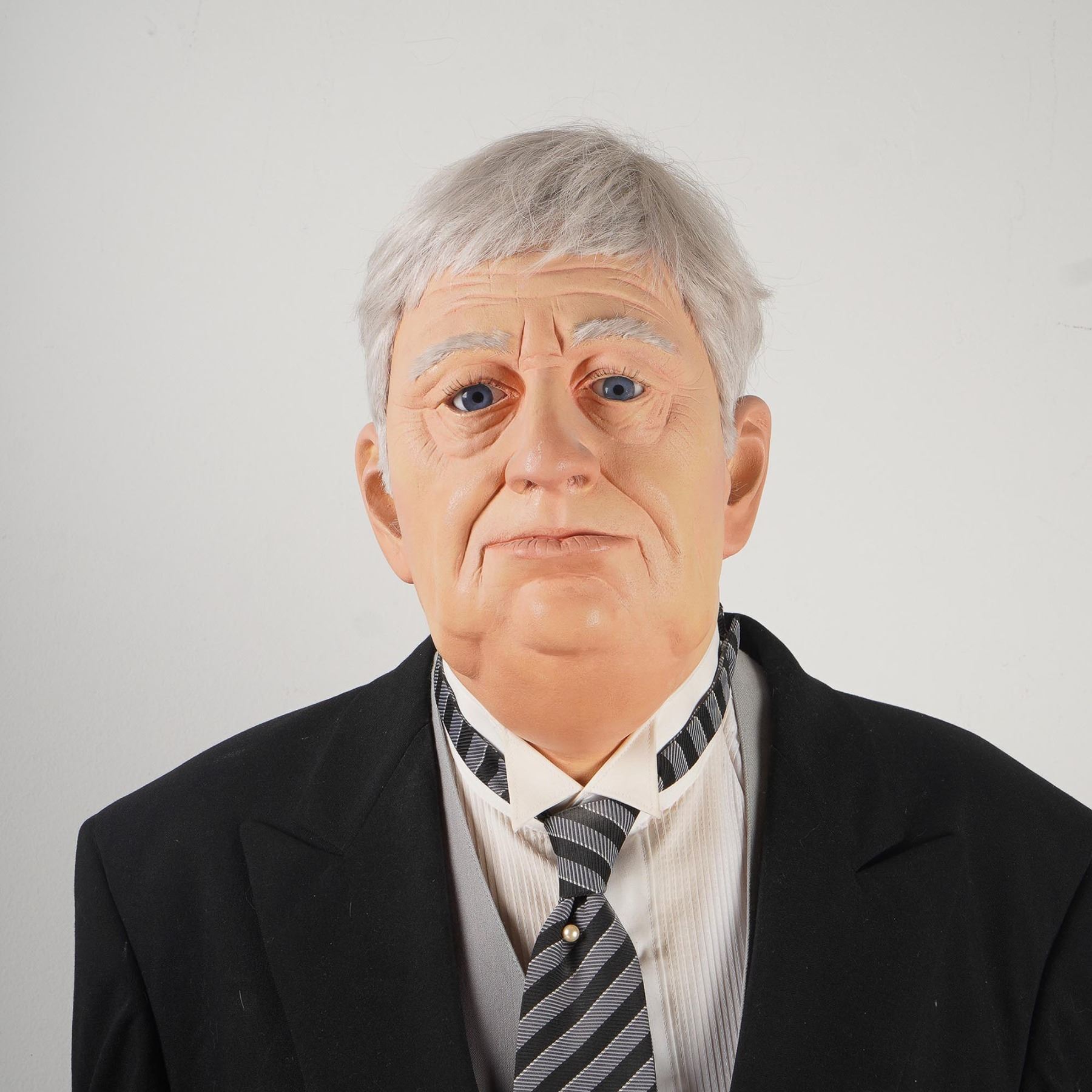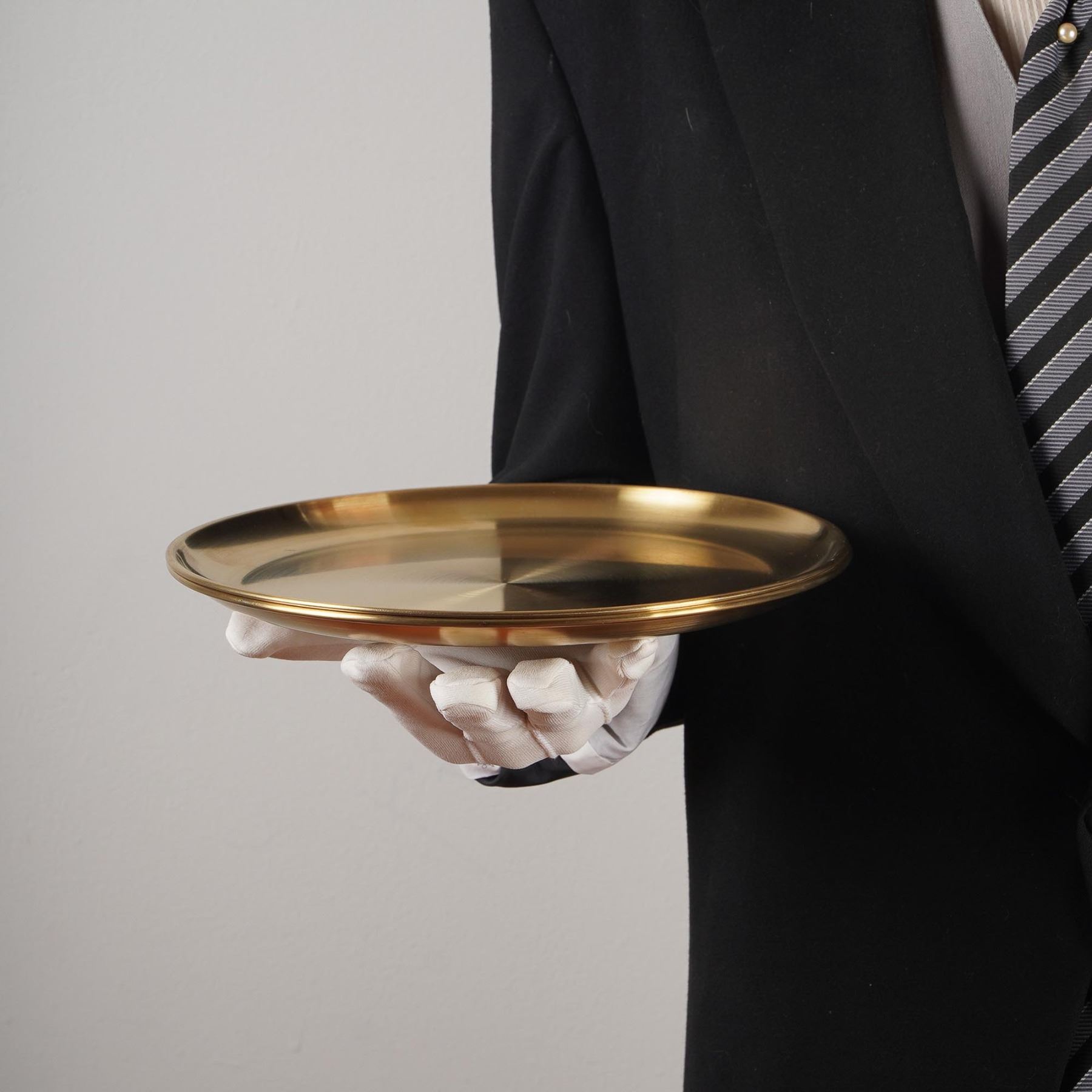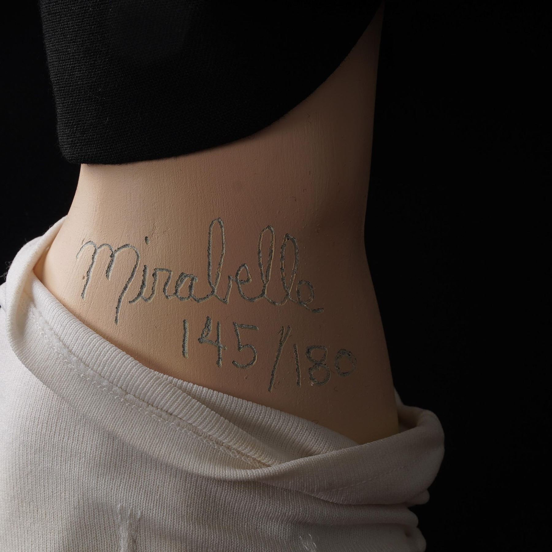 A striking life-size butler sculpture by Gary Mirabelle, numbered 145 of 180 and signed on the left hand. This unique piece captures a humorous yet detailed representation, dressed in a black suit with a striped tie and white gloves. Known for his whimsical and surreal figures, Mirabelle’s works are highly collectible. While not animated, this sculpture is anatomically correct and stands on a sturdy black base. Included in this lot are two brass platters, each measuring 10.25"diameter and a booklet detailing the artist and his lifelike creations. A rare and conversation-starting display piece. Signature on the hand. Measures 69"H.