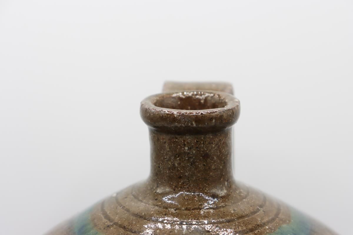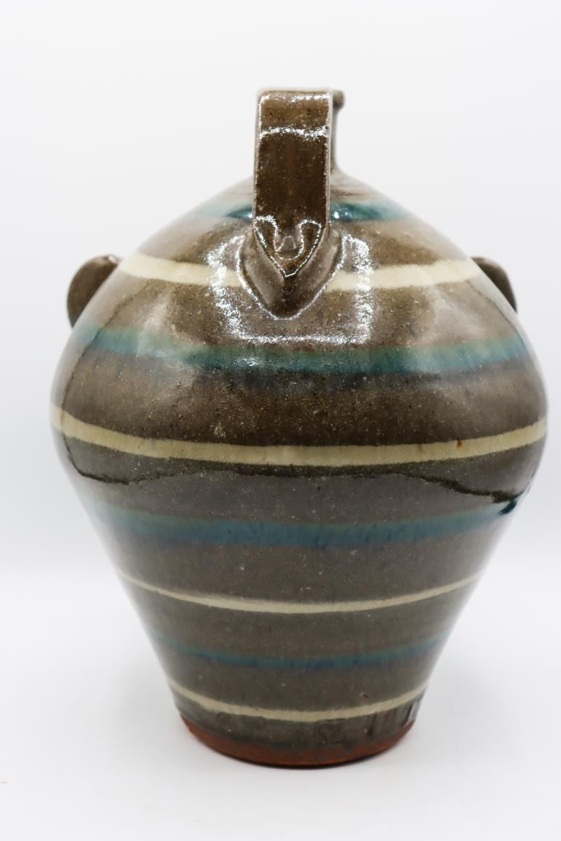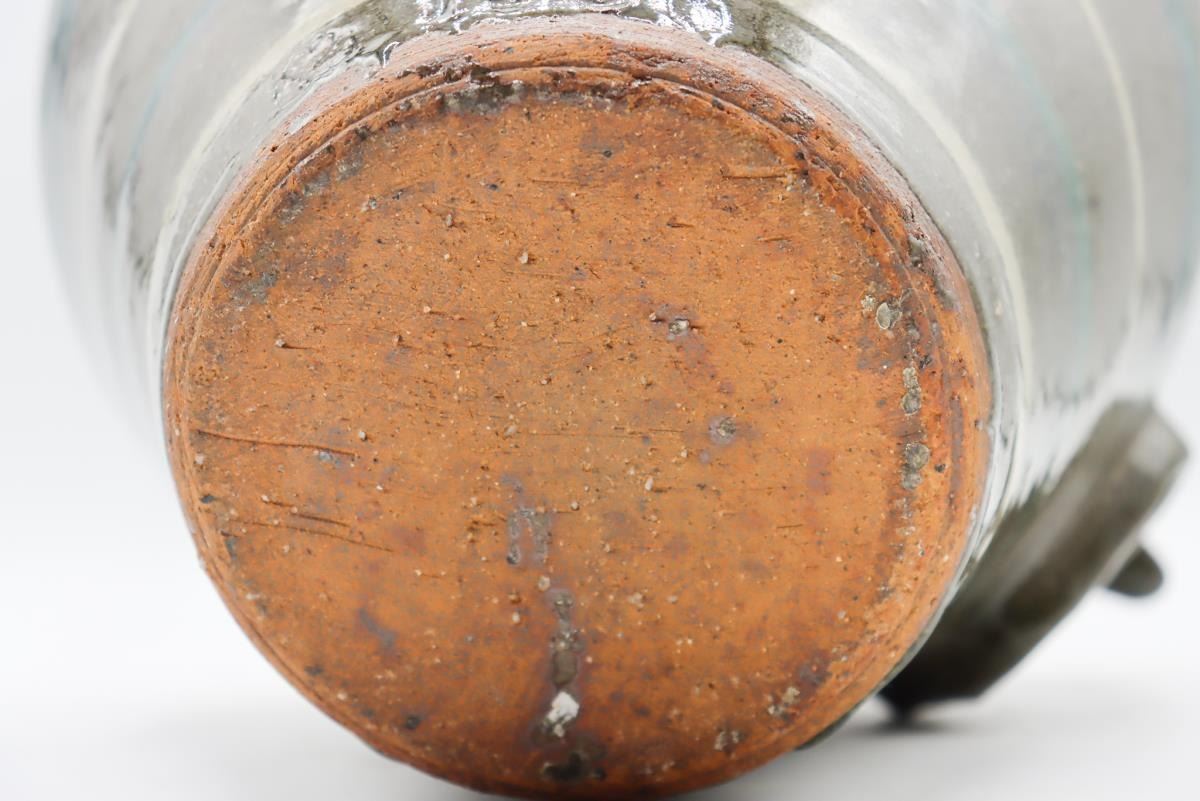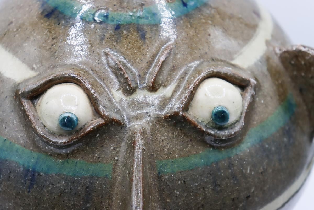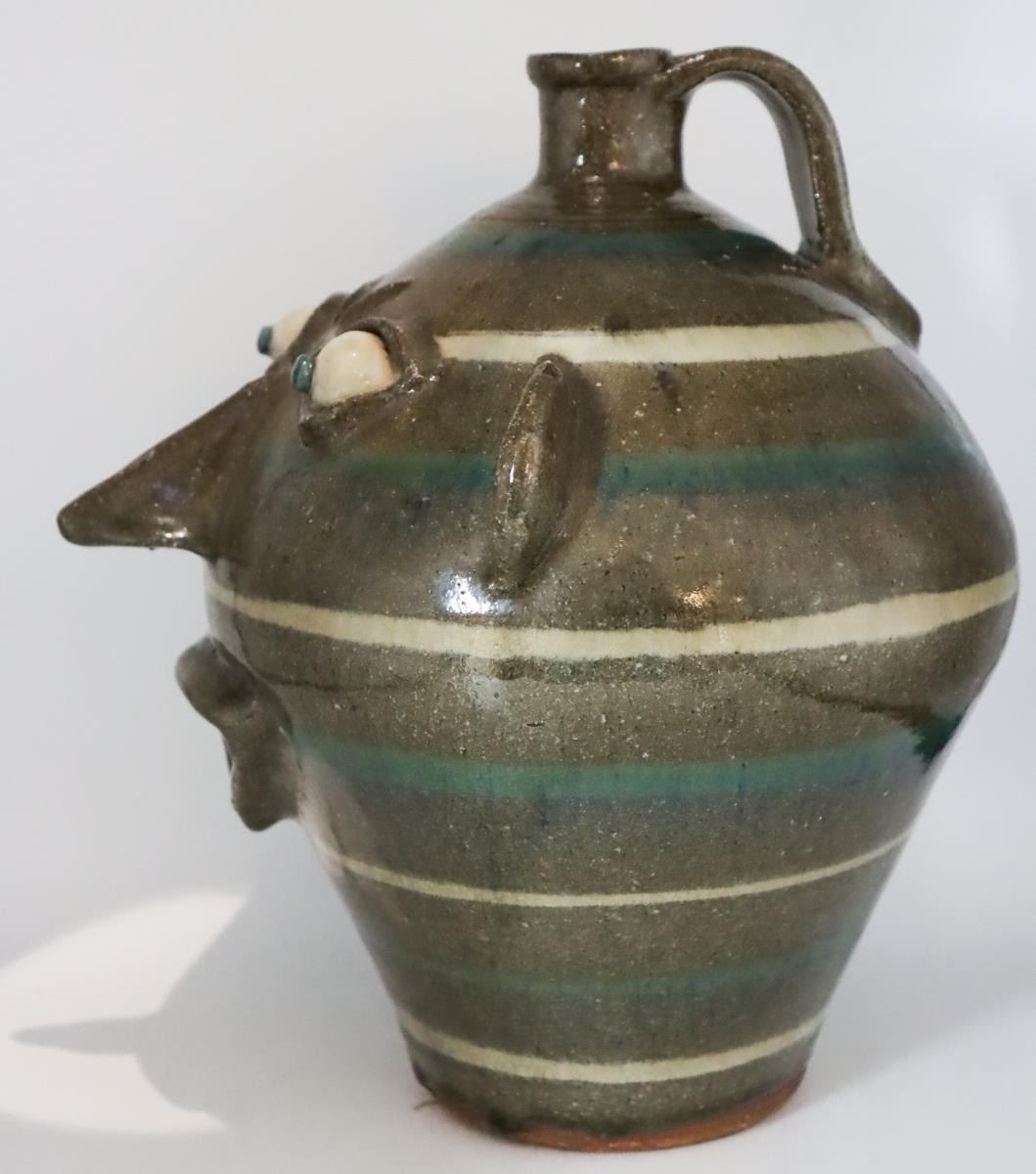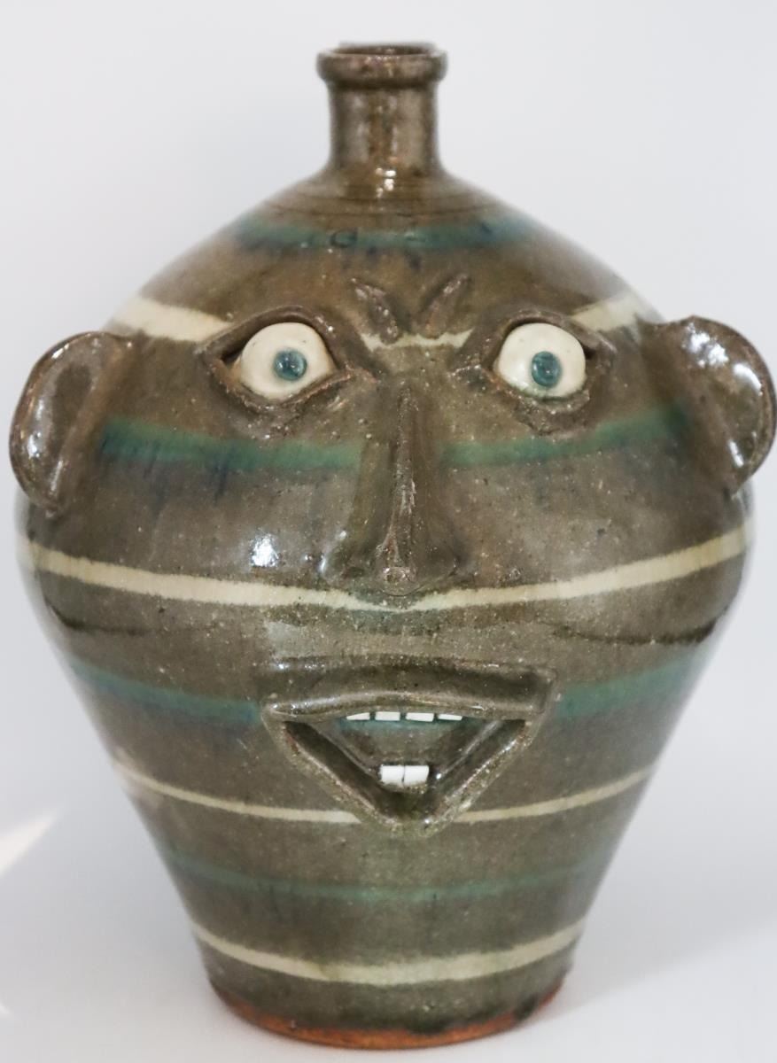 Awesome green and white stripe face jug with pointy nose made by master of the craft, Gary Mitchell, marked “GM”.