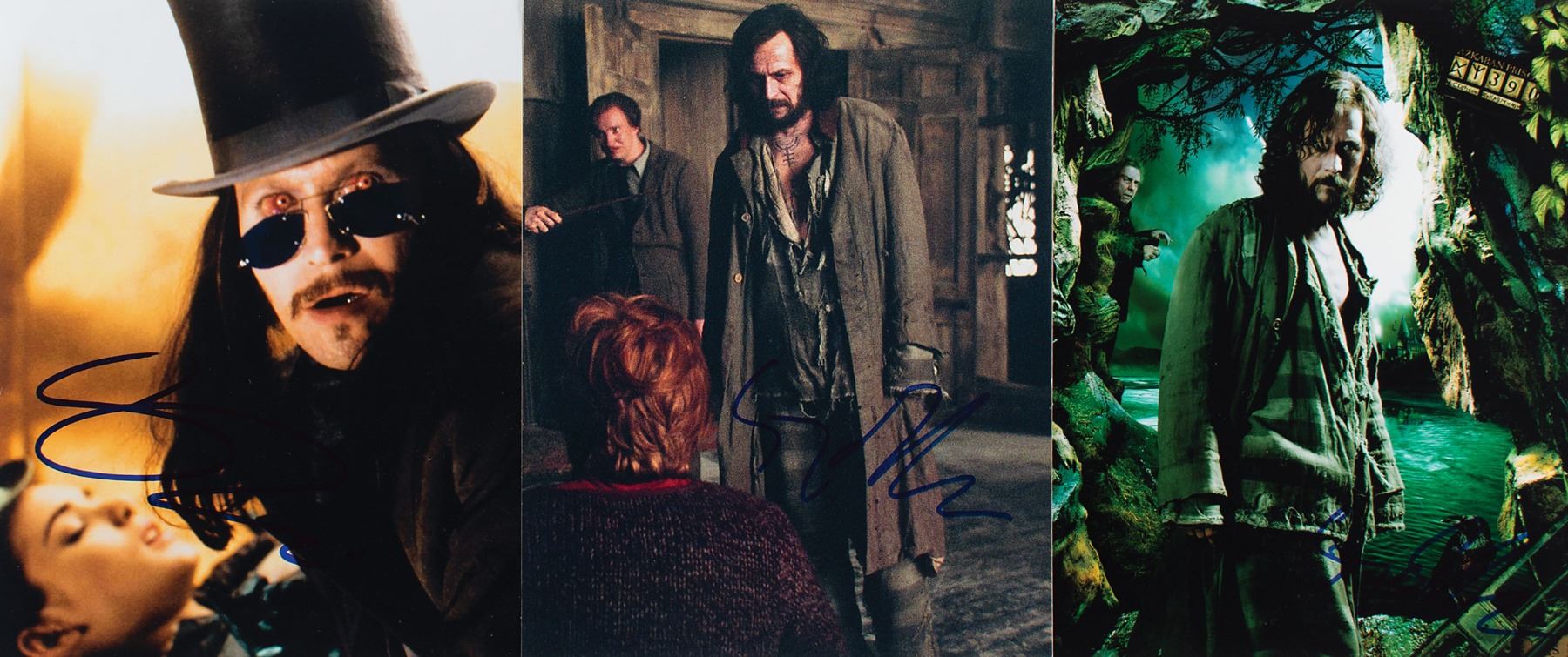 Three color glossy 8 x 10 photos of Oldman in character—two as Sirius Black in the Harry Potter series and one as the red-eyed Count Dracula from Francis Ford Coppola's 1992 horror film Bram Stoker's Dracula—each signed in blue felt tip. In fine condition, with some light creasing to the Dracula pose. Originally obtained by in-person specialist Mike Wehrmann.