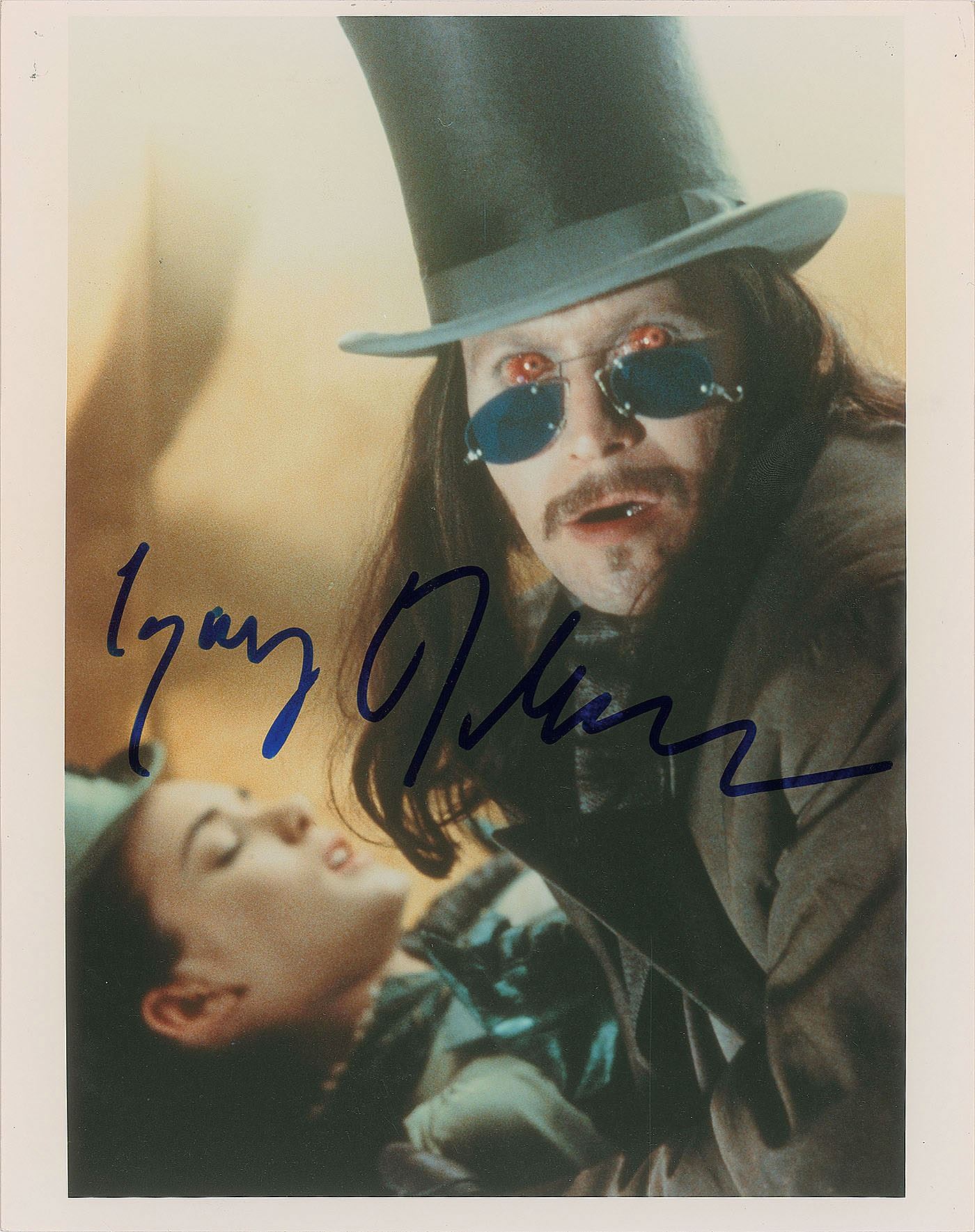Color glossy 8 x 10 photo of Oldman as the red-eyed Count Dracula from Francis Ford Coppola's 1992 horror film Bram Stoker's Dracula, signed in blue felt tip by Oldman. In fine condition.