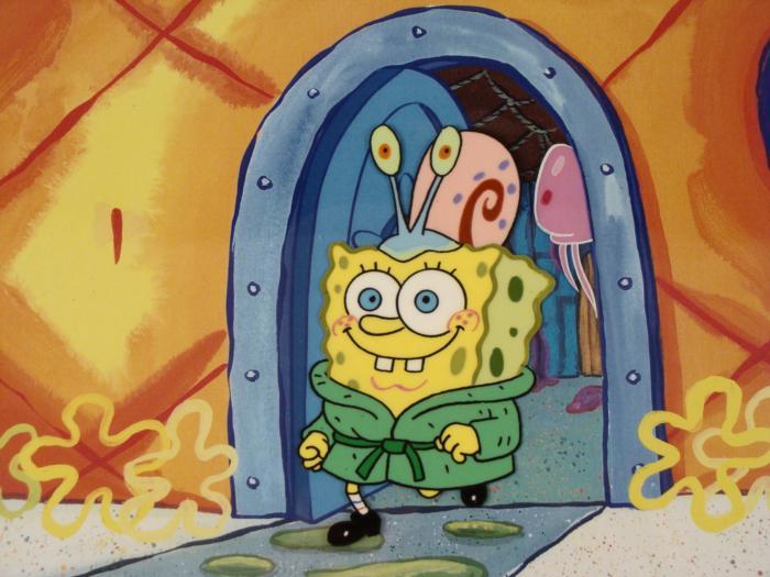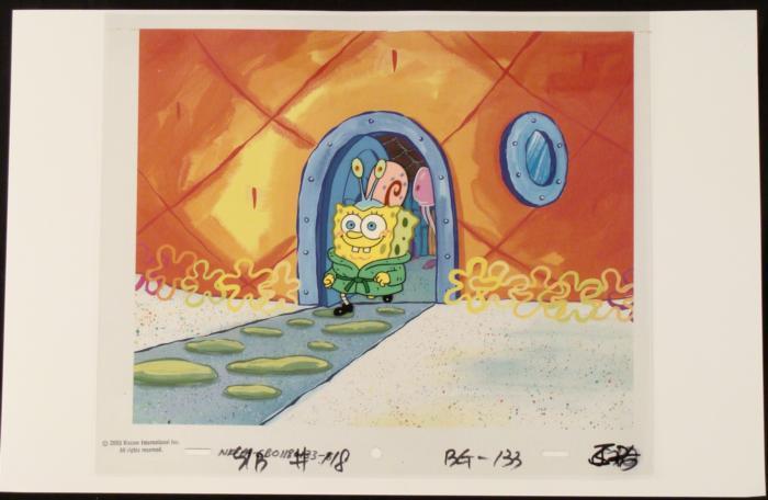 This animation cel and reproduction background are from the Nickelodeon TV show SpongeBob Squarepants. The story takes place under the deep blue sea in Bikini Bottom, where SpongeBob resides. SpongeBob, who is a yellow, porous sponge, is your typical happy-go-lucky character, as he is always cheerful and enjoys making people laugh. Patrick Star, SpongeBob's neighbor who is a starfish, is your average children's show idiot, as he boasts knowing nothing and is often getting himself into ridiculous situations. Between the homes of these two lies the home of the miserable Squidward, a squid, who is known for being grouchy and playing tricks on SpongeBob and Patrick. Both SpongeBob and Squidward work at the Krusty Krab, a fast food business run by the greedy money-loving Mr. Krabs, a crab, the arch rival of the evil, possibly misunderstood, Plankton. Another neighbor, Sandy Cheeks, an athletic squirrel who normally wears an astronaut's space suit, was introduced in "Tea at the Treedome." She spends most of her time inventing and experimenting. SpongeBob has Gary on his head.Original Printed Background and Animated Cel Overall Size of Background: 11" x 17" Overall Size of the Cel: 10 1/2" x 12 1/2" Very good condition This is an original hand-painted cel set-up used in the production of an episode of "SpongeBob SquarePants." Each one-of-a-kind set-up represents a slight change in position of the characters. When individually photographed and projected in rapid succession, the images appear to move.