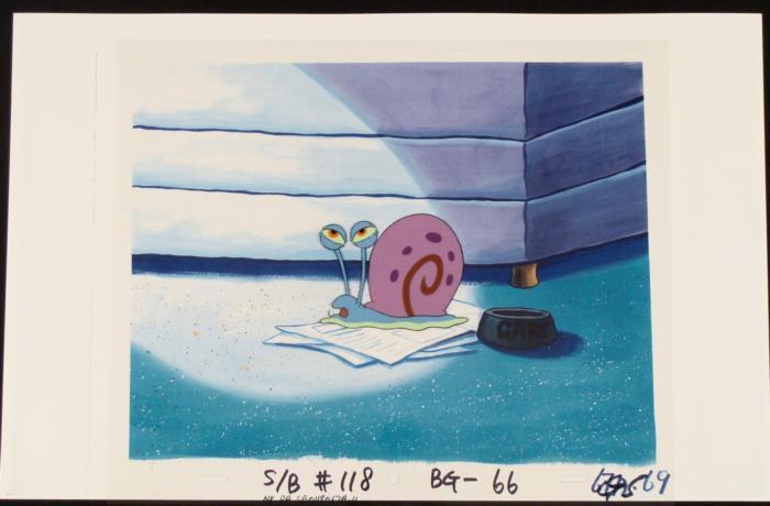This reproduction background and animation cel is from the Nickelodeon TV show SpongeBob Squarepants. The story takes place under the deep blue sea in Bikini Bottom, where SpongeBob resides. SpongeBob, who is a yellow, porous sponge, is your typical happy-go-lucky character, as he is always cheerful and enjoys making people laugh. Patrick Star, SpongeBob's neighbor who is a starfish, is your average children's show idiot, as he boasts knowing nothing and is often getting himself into ridiculous situations. Between the homes of these two lies the home of the miserable Squidward, a squid, who is known for being grouchy and playing tricks on SpongeBob and Patrick. Both SpongeBob and Squidward work at the Krusty Krab, a fast food business run by the greedy money-loving Mr. Krabs, a crab, the arch rival of the evil, possibly misunderstood, Plankton. Another neighbor, Sandy Cheeks, an athletic squirrel who normally wears an astronaut's space suit, was introduced in "Tea at the Treedome." She spends most of her time inventing and experimenting. Gary in squintingOriginal Printed Background and Animated Cel Overall Size of Background: 10 1/2" x 17" Overall Size of the Cels: 10 1/2" x 12 1/2" Very good conditionThis is an original hand-painted cel set-up used in the production of an episode of "SpongeBob SquarePants." Each one-of-a-kind set-up represents a slight change in position of the characters. When individually photographed and projected in rapid succession, the images appear to move.