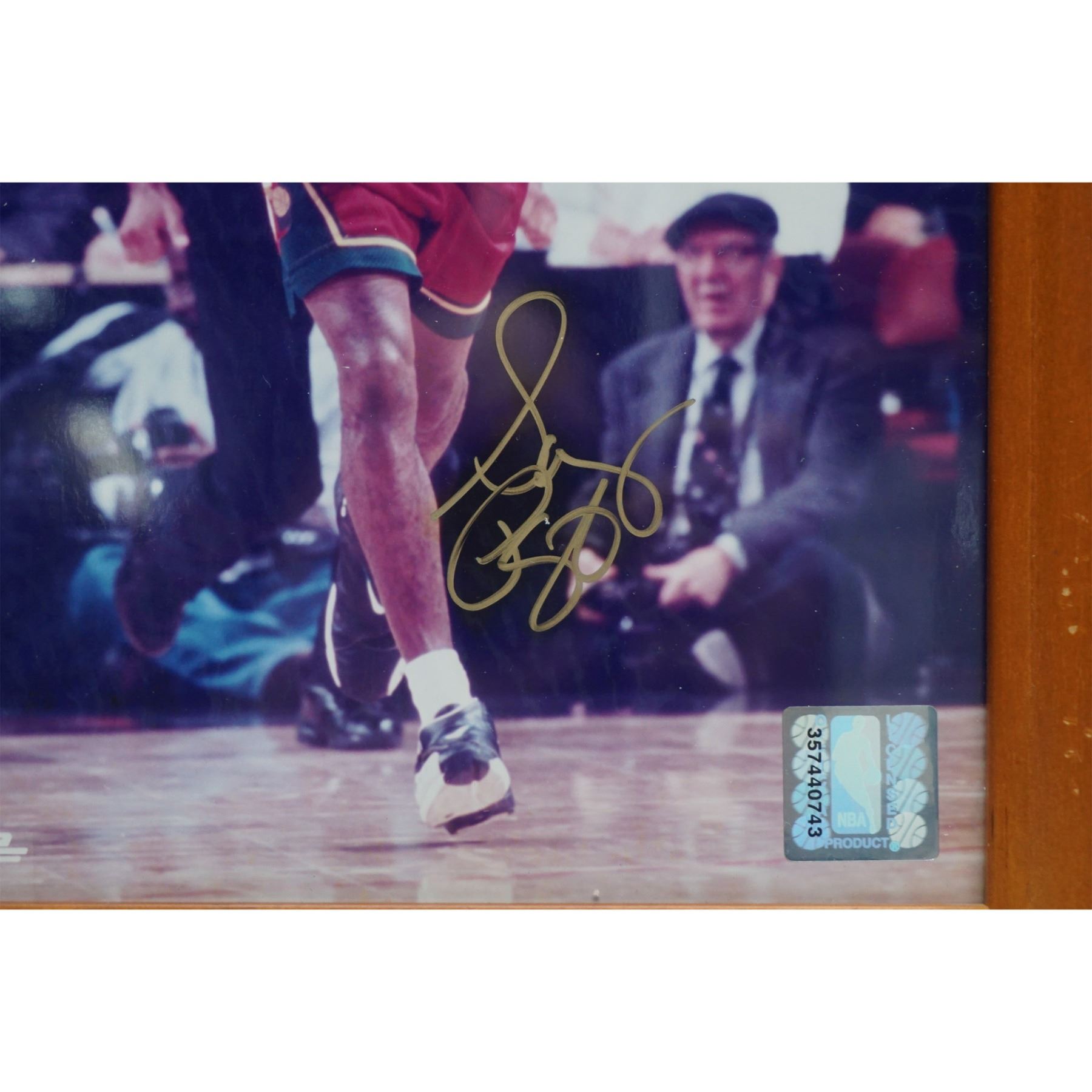 A framed autographed photograph of NBA Hall of Famer Gary Payton in action with the Seattle SuperSonics. The photograph features Payton dribbling down the court in his signature number 20 jersey. The autograph is prominently signed in gold ink and includes an official NBA authentication hologram. The frame is wooden with a glass front, preserving the integrity of the image and signature. Included is a Certificate of Authenticity (COA) from Meridian, verifying the authenticity of the signature.