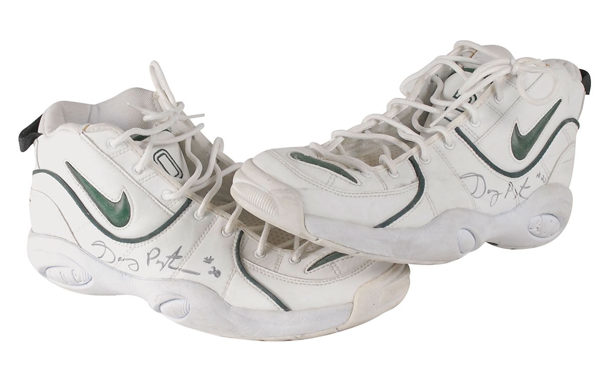 Pair of white and green Nike Air basketball sneakers featuring Payton’s number 20 on the tongue, size 13, each signed on the side in black felt tip, “Gary Payton, #20.” General overall wear and light soiling, otherwise fine condition.