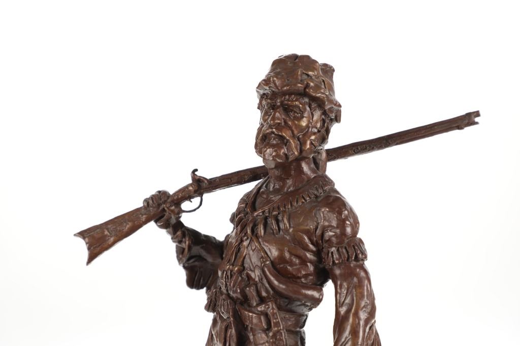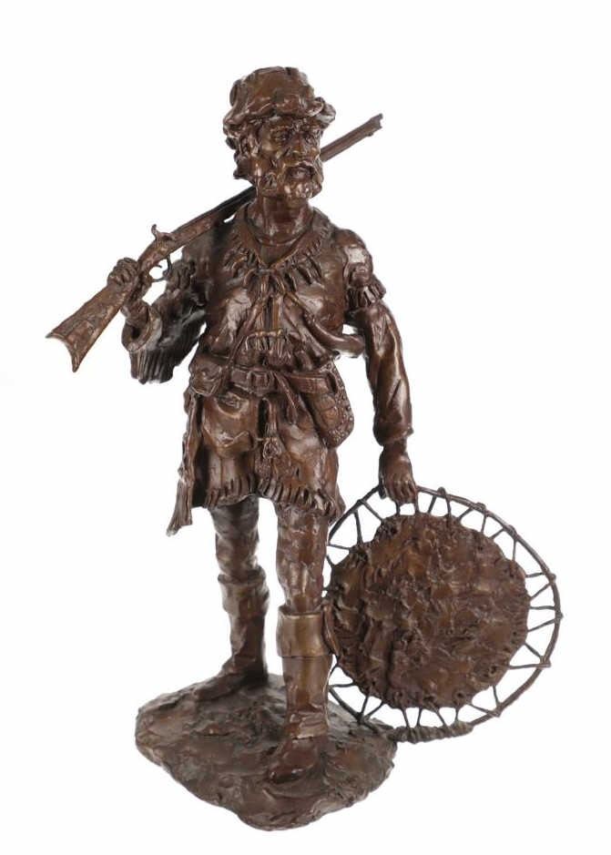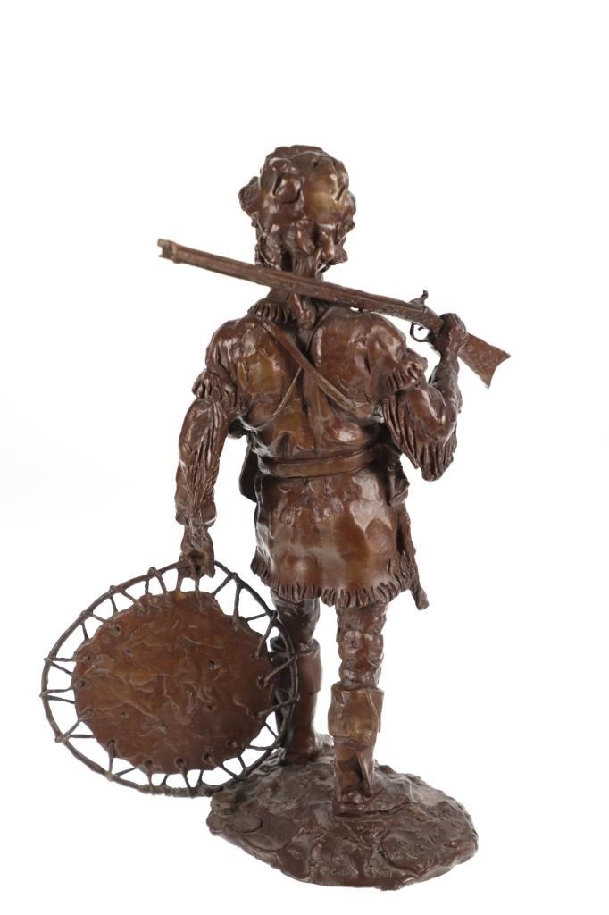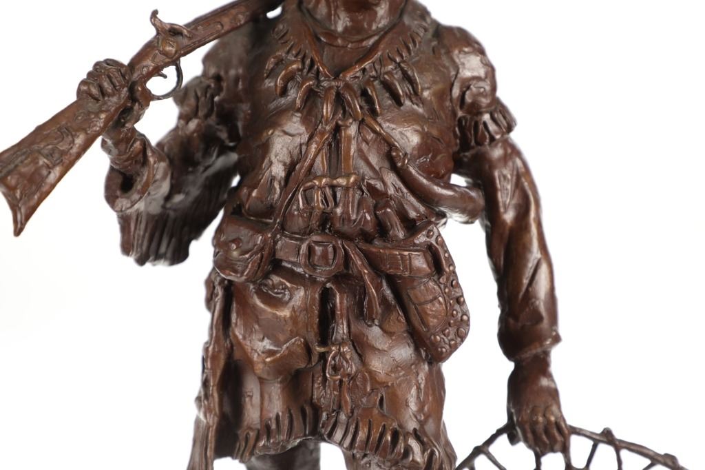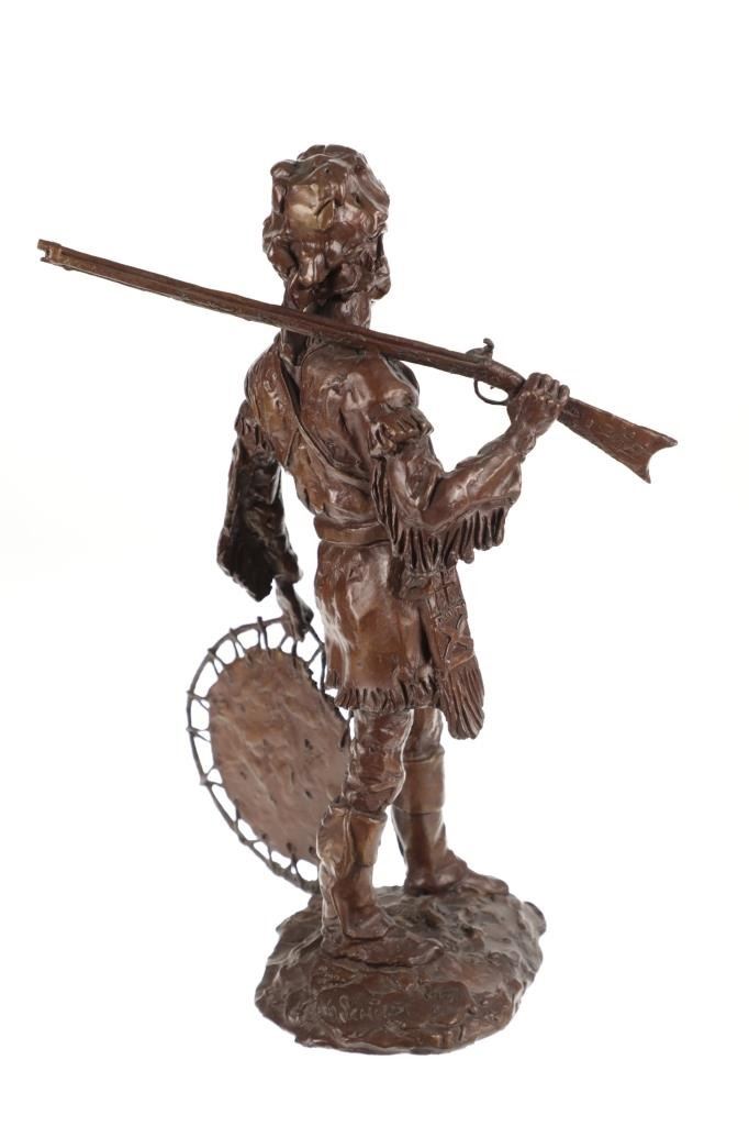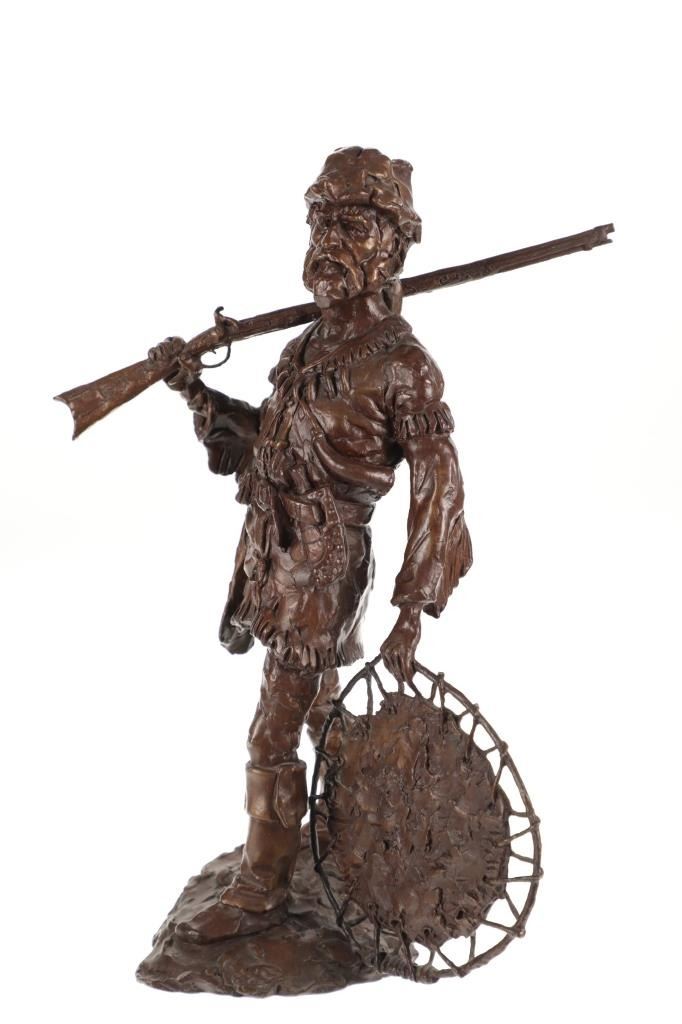 Featured in this lot is this bronze of a frontier hunter by Montana artist Gary Joseph Schildt born in 1938 and died in 2021. The The bronze features a wonderfully and professionally crafted bronze construction the shows the iconic figure of a frontier hunter holding his rifle in his right hand and on his right shoulder and holding a tanning board in his left hand. The bronze is marked as follows: 10/1000 - C.S. 1981 - G Schildt - 1981. The bronze shows the foundry mark that is inscribed Powell Bronze - Kalispell, Mont.