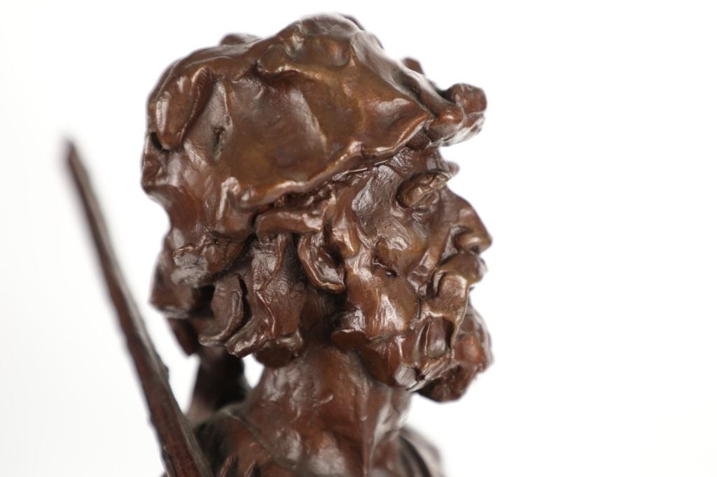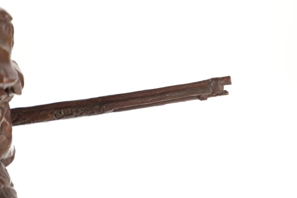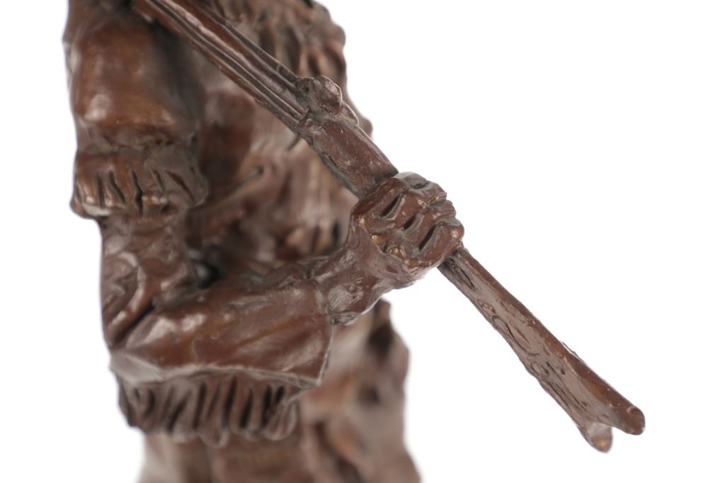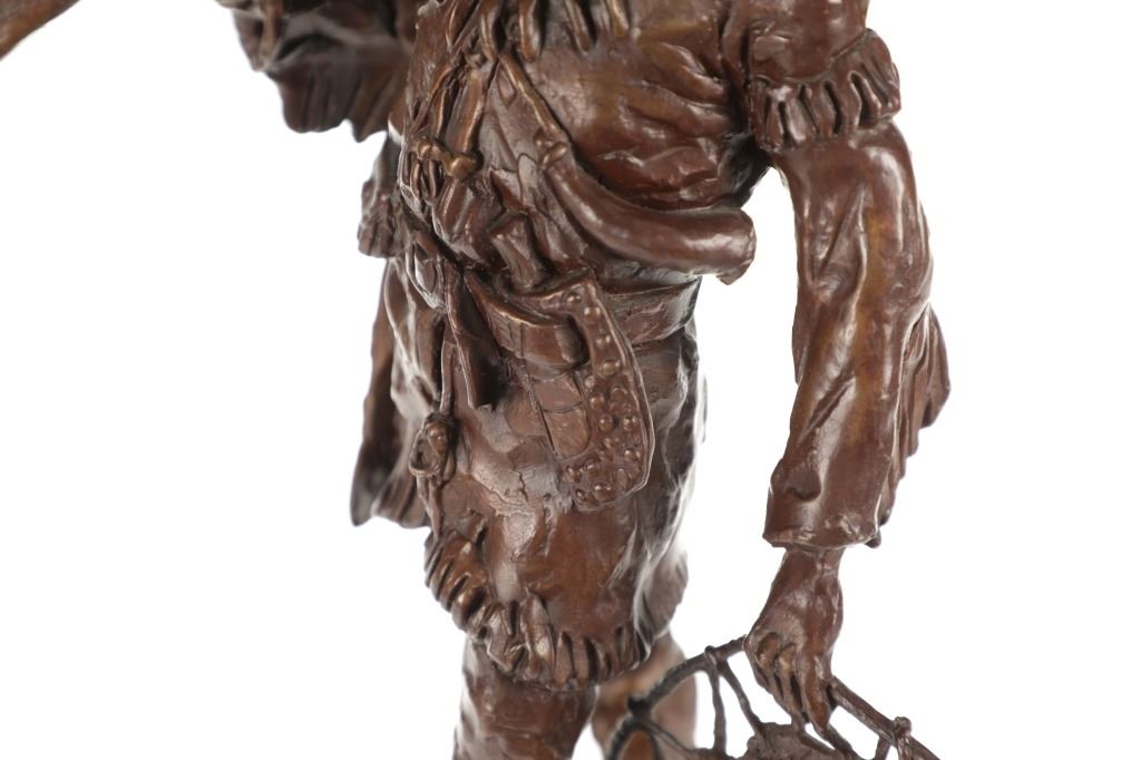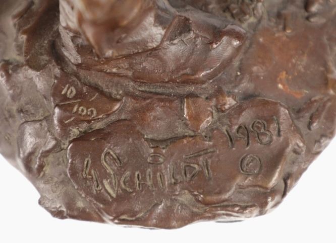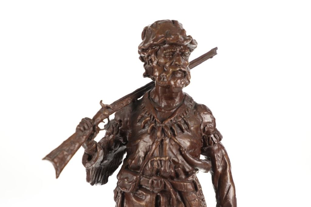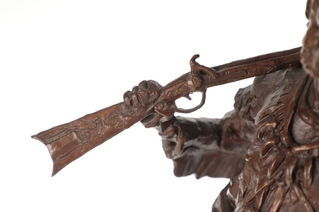 Featured in this lot is this bronze of a frontier hunter by Montana artist Gary Joseph Schildt born in 1938 and died in 2021. The The bronze features a wonderfully and professionally crafted bronze construction the shows the iconic figure of a frontier hunter holding his rifle in his right hand and on his right shoulder and holding a tanning board in his left hand. The bronze is marked as follows: 10/1000 - C.S. 1981 - G Schildt - 1981. The bronze shows the foundry mark that is inscribed Powell Bronze - Kalispell, Mont.