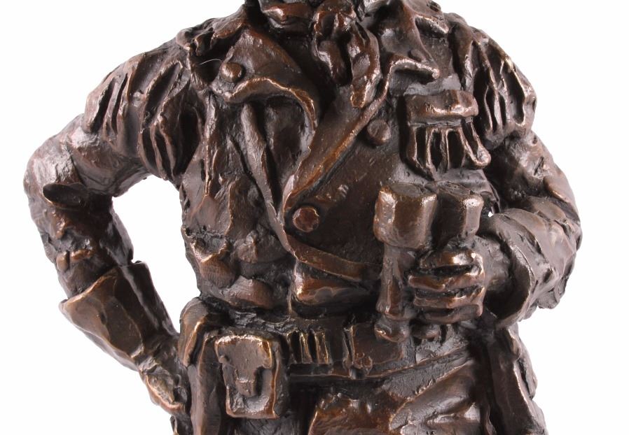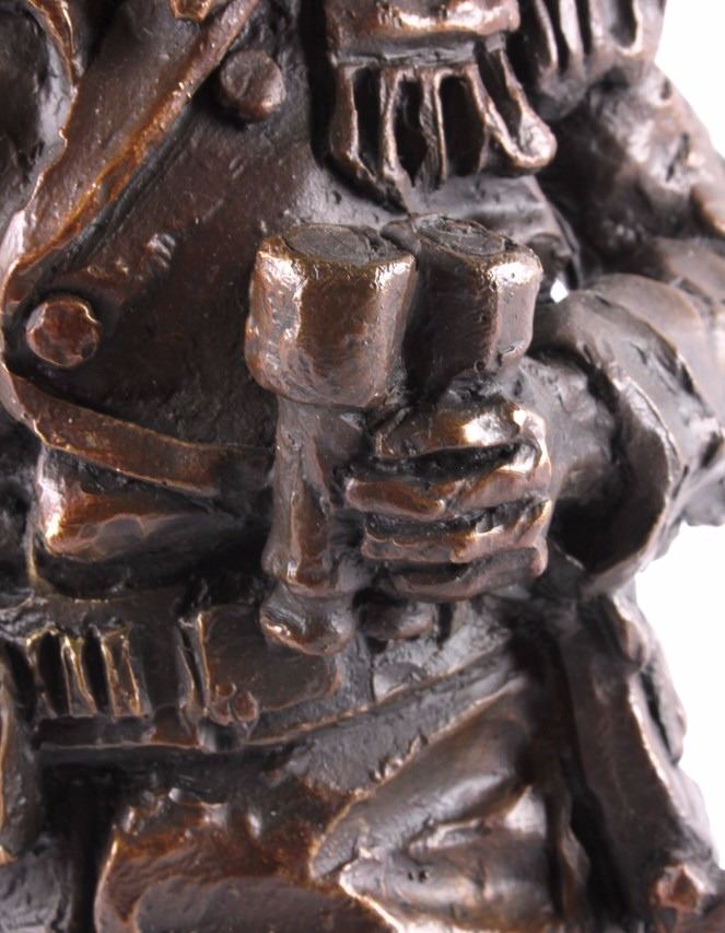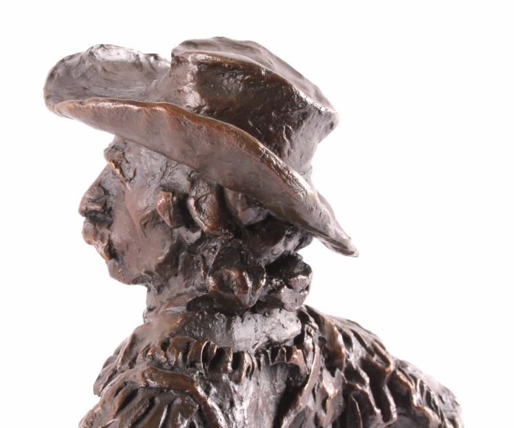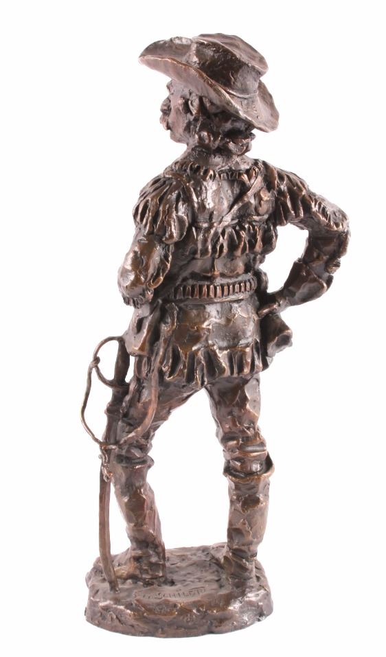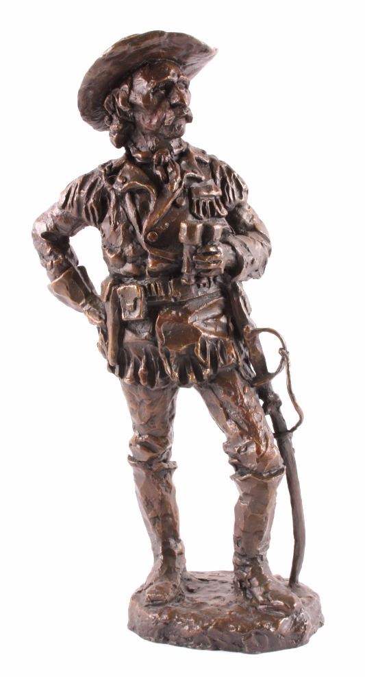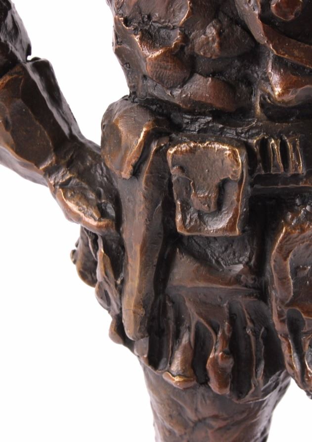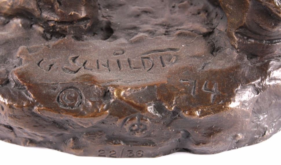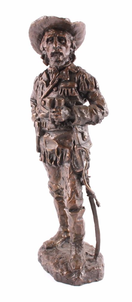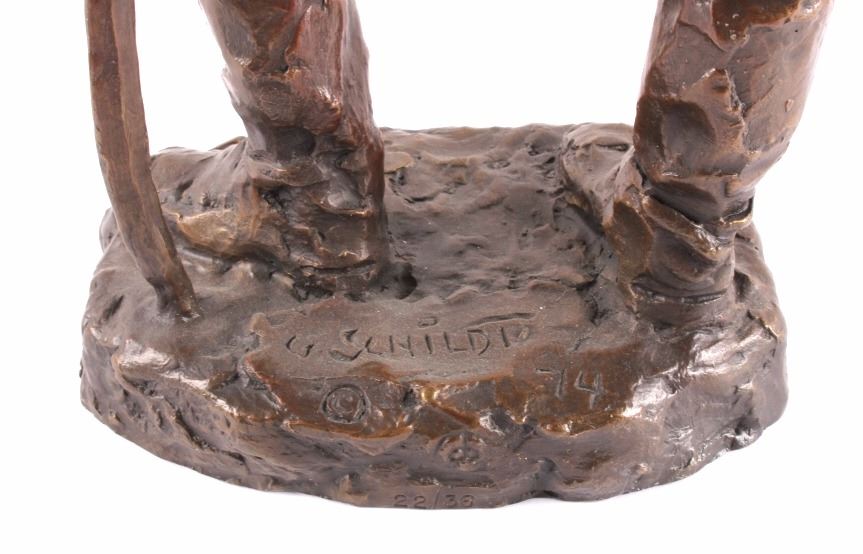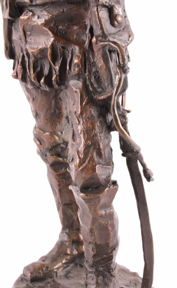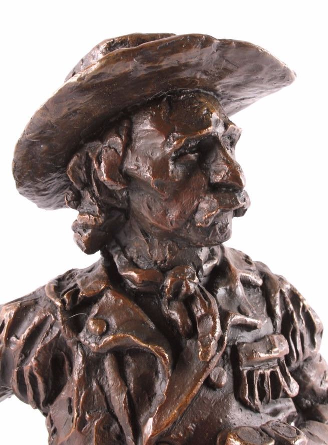 This is an original bronze sculpture by Gary Schildt. The sculpture depicts General Custer from Schildt's "Custer Series". Schildt produced this series in the 1970's to include General Custer, Sitting Bull, Major Reno, Curley Indian Scout, and Trooper. Schildt is one of Montana's best known and accomplished artists. He remains an active member of the Blackfeet Tribe and lives in East Glacier, Montana. This bronze is dated 1974 and is numbered 22/36. It is in very good condition. A fantastic and scarce piece from a prominent Montana artist. The bronze measures 4" x 8" and is 17" tall.