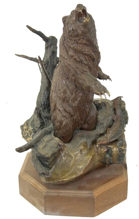 Ca. 1983, Large signed limited edition (#21/50) showing a roaring grizzly bear in a stream catching a salmon. Very good condition. 17" x 10" x 12"