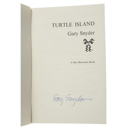 <B>Gary Snyder Signed:<I> Turtle Island.</B></I></B></I> (New York: New Directions Books, 1974), sixth printing, 114 pages, signed <I>Gary Snyder</B></I> on the title page, in stiff pictorial wraps, 8vo (5.25 x 8), very good condition. Snyder's book won the Pulitzer Prize for poetry in 1975.<BR><BR><b>Shipping:</b> Books & Catalogs (<a target="_blank" href="http://www.heritageauctions.com/common/shipping.php">view shipping information</a>)
