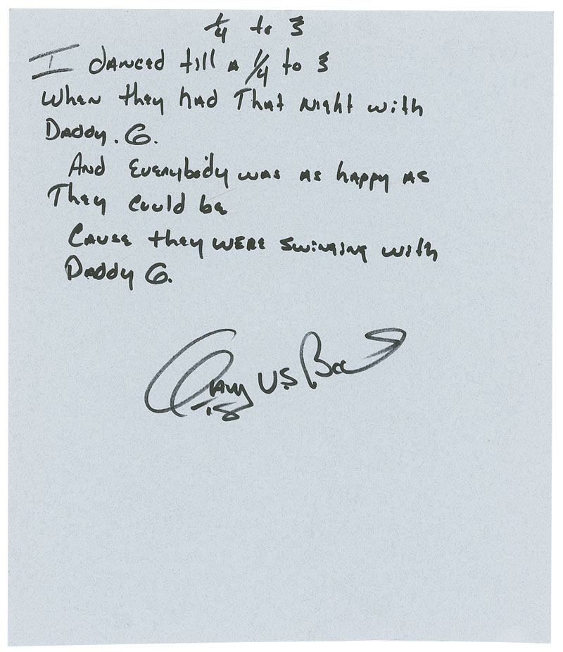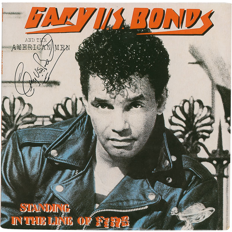 Two items: Standing in the Line of Fire album, signed on the front in black felt tip, “Gary U. S. Bonds”; and handwritten souvenir lyrics to ‘Quarter to Three,’ on an off-white 8.5 x 9.75 trimmed sheet of paper, signed at the conclusion, “Gary U. S. Bonds.” In fine condition.