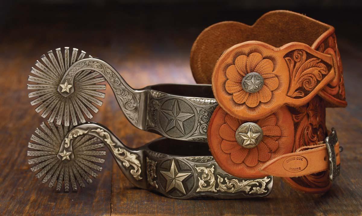 Maker-marked WIGGINS 339-09 double mounted steel spurs with sterling silver overlay, featuring raised Lone Star and intricate scroll patterns. Off-side engraved in iron with mirrored design. 2 1/4", 28 pt chased rowels with Texas Star rowel pin covers, swinging buttons of engraved steel and silver. Floral carved Doug Cox two-tone leathers with Wiggins marked floral engraved steel buckles. Born in 1961, Gary learned silversmithing from his dad, Denzil, who made Indian jewelry. While working for a rancher around Castle Rock, Colorado, in the mid 1990s, Gary started building bits and spurs using the Indian jewelry skills that his father taught him - yet integrating his own distinctive cowboy style by applying silver and engraving. While attending classes put on by the Traditional Cowboy Arts Association (TCA) in Oklahoma, he had a great opportunity to study with several of the renowned contemporary spur makers. Also, sharing ideas and techniques with good friends Russell Yates (TCA) and Kevin Peebler, Gary split his time making both good cowboy using gear, and more stylized pieces, integrating both Texas style with California style. Gary has also had the pleasure and honor to build several pieces for Adolph Bayers expert, J. Martin Basinger. Gary and his wife and partner, Cynthia, work as a team, with her keeping the books, cutting silver, and polishing, while he is busy expanding his engraving talents. Gary is a student of the trade and his pieces are highly sought after by cowboys and collectors all over the United States.