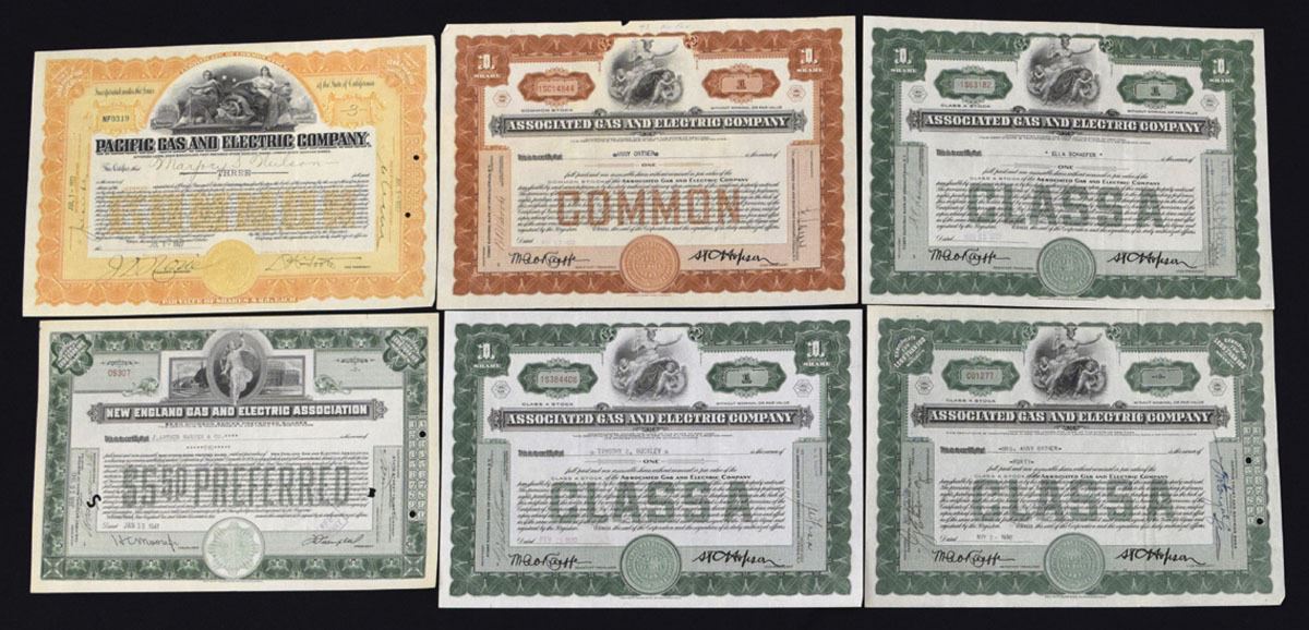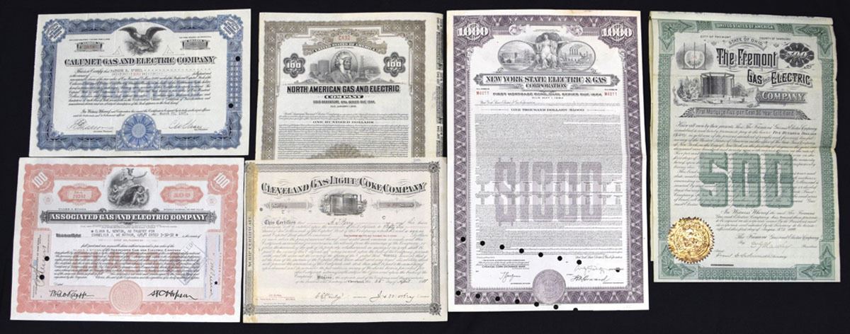 Various States, ca. 1900-40s. Lot of 12 issued stock and bond certificates from gas and electric companies. Highlights include: Pacific Gas and Electric Co.; Associated Gas and Electric Co.; New England Gas and Electric Association; Fremont Gas and Electric Co.; New York State Electric & Gas Corp.; North American Gas and Electric Co.; Calumet Gas and Electric Co.; and Cleveland Gas Light Coke Co. Condition ranges VF to XF, with some punch and ink cancellations, folds, and light handling. (12). Sold “AS IS” no returns accepted.