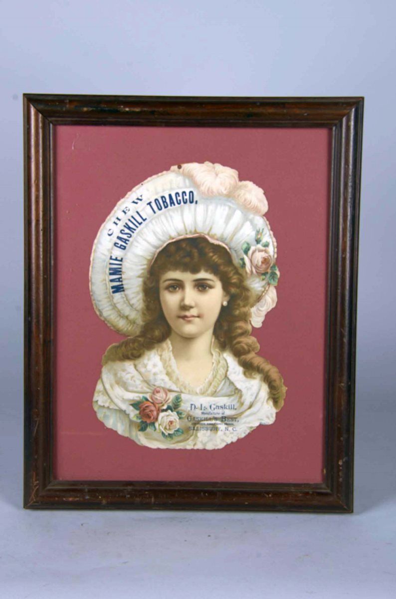 Reads "D.C. Gaskill Manufacturer of Gaskill Tobacco - Chew Mamie Gaskill Tobacco" featuring Victorian style woman circa 1910s. Condition (Very good). Size 16.5" x 20.5"