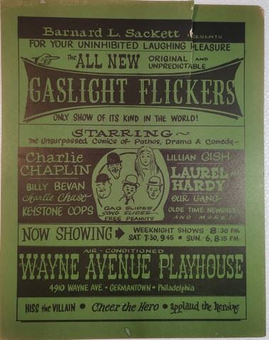 Gaslight Flickers (Barnard L. Sackett) lobby card. Comedy. Starring Charlie Chaplin, Billy Bevan, Charlie Chase, Keystone Cops, Lillian Gish, Laurel & Hardy, Our Gang, Olde Time Newsreel. Some edge wear, some creases, some paper loss, stains, tears. Fine. (11"x14").