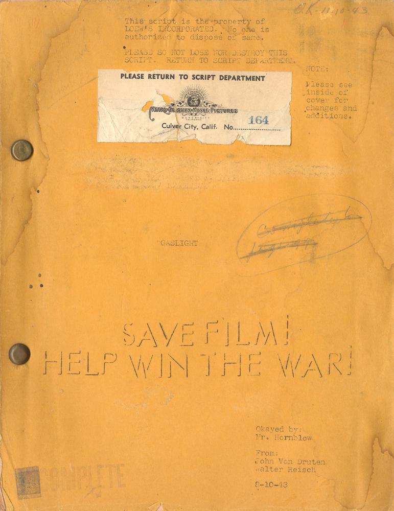 (MGM, 1944) Complete studio script, 127 pp., in original printed cover dated 8/10/43,, with pink revision pages through 11/15/43. Gaslight is revered among fans of the American film noir genre. Its tale of mental manipulation by a ruthless criminal to convince his innocent and trusting wife of her presumed inherited madness is so well told that the psychological syndrome became known by the film’s title. Noticeable handling and age to covers (though they remain intact) with interior Very Fine.