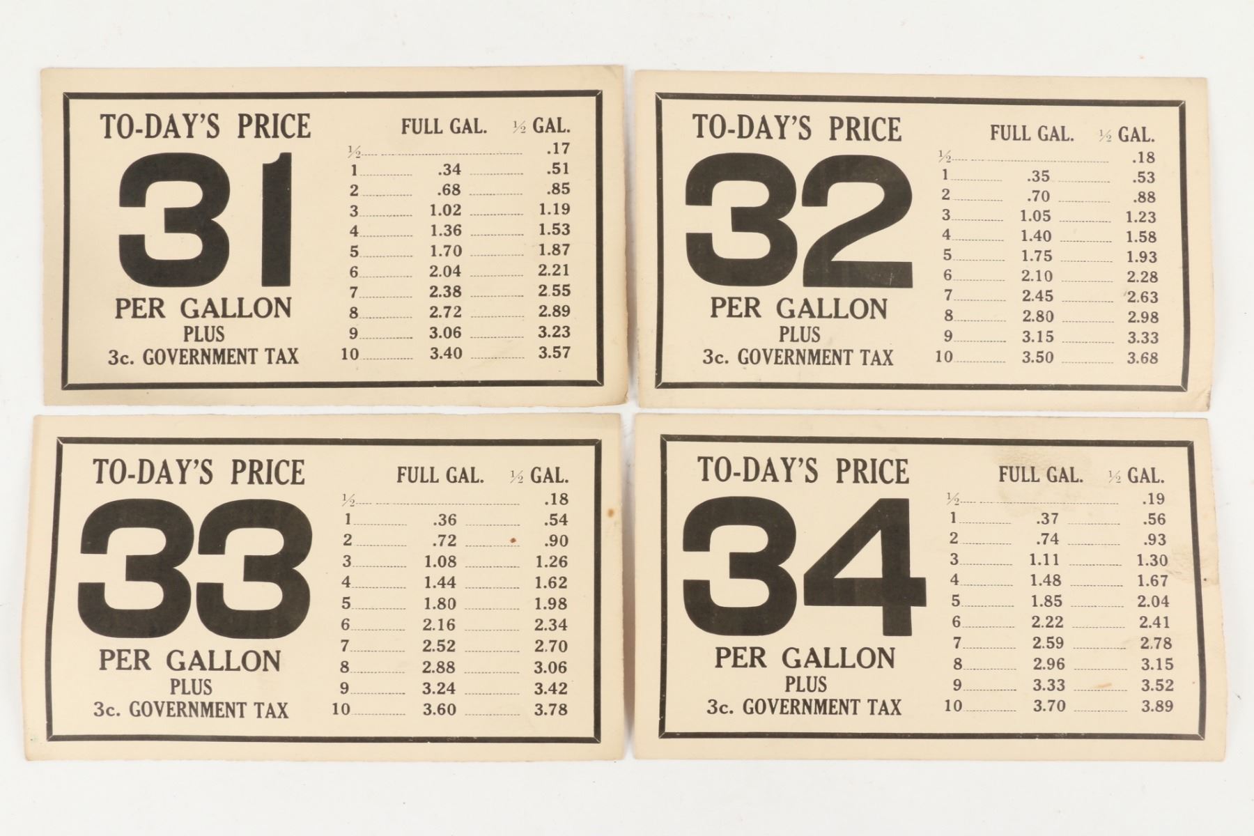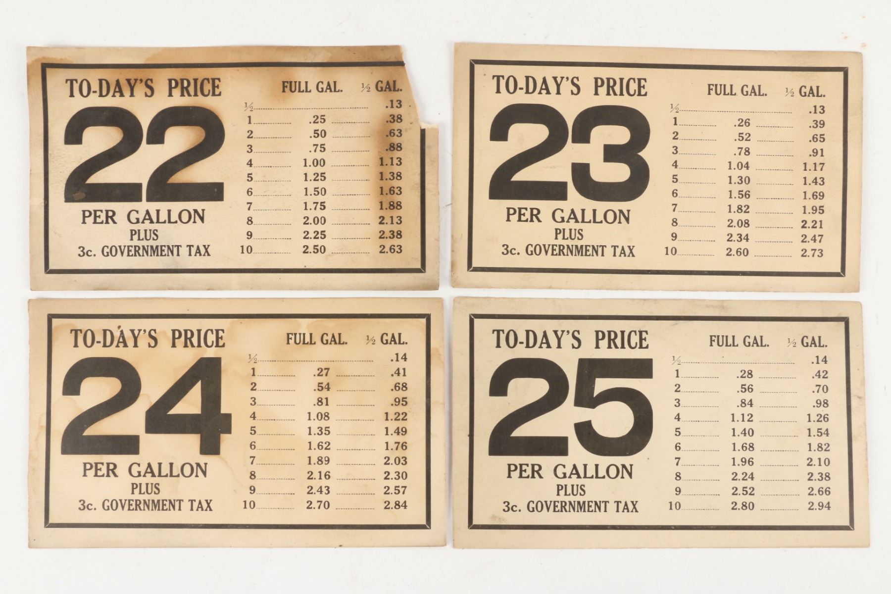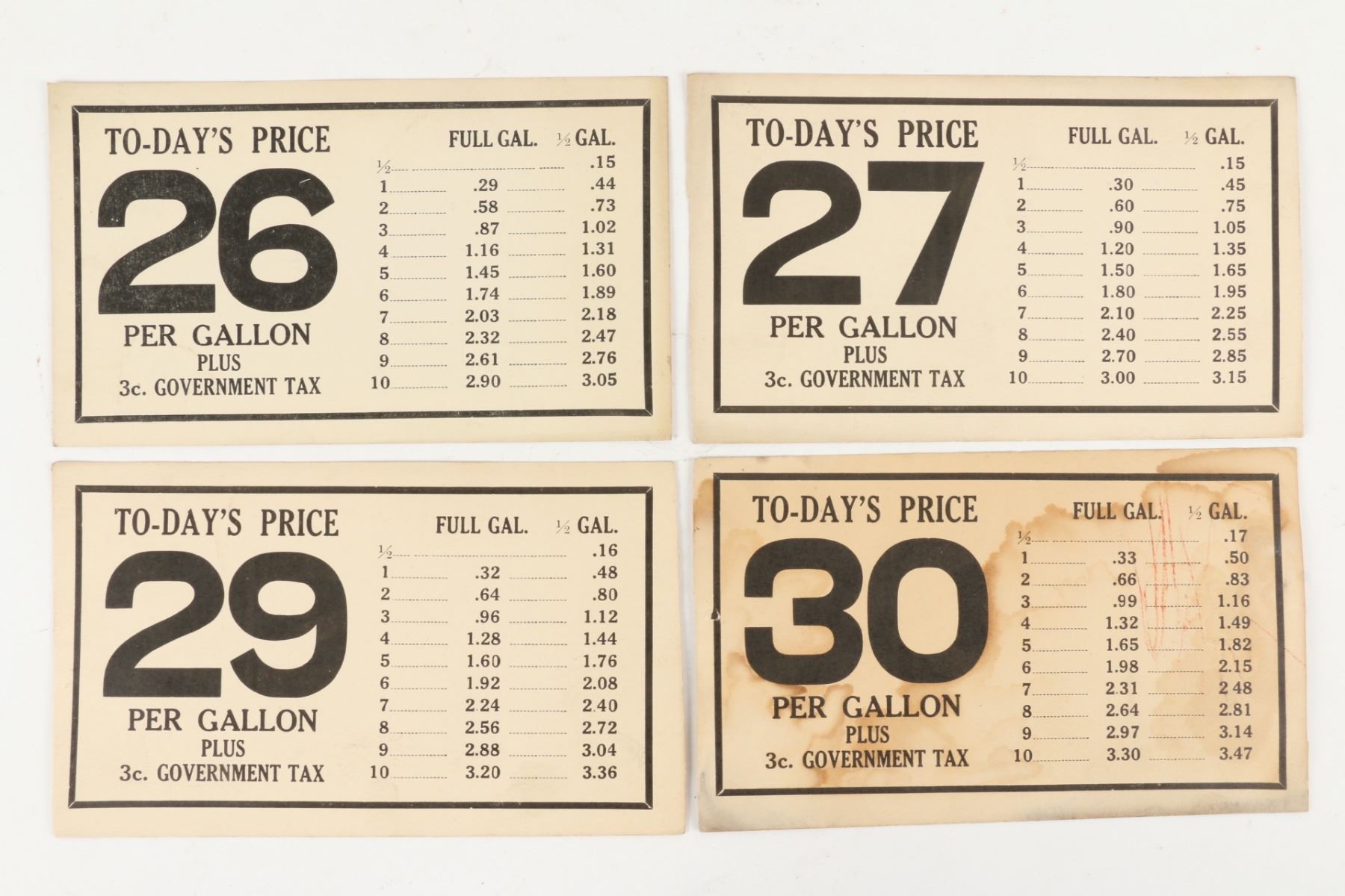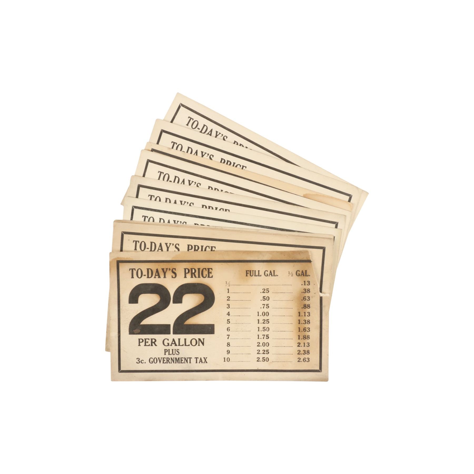 Canadian. Rare. 13 cards, 22c to 35c, missing "28c" card. Used to display current pricing on 10-gallon gasoline pumps. 7" x 4.25". Minor soiling. Corner loss to one card. $100-200.
