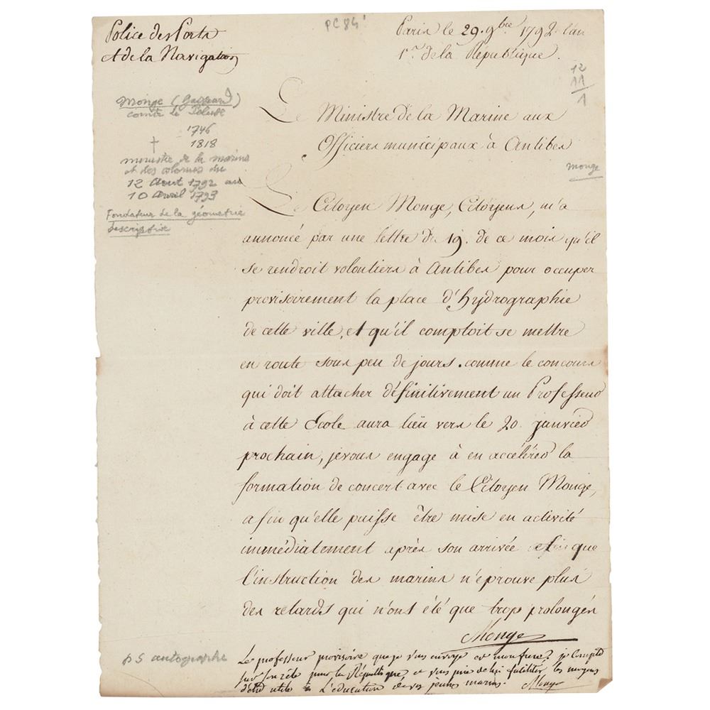 LS in French, signed twice, ‰ÛÏMonge,‰Û one page, 7 x 9.25, November 29, 1792. Letter to the "Ministre de la Marine" at Antibes, volunteering to go there to "temporarily occupy the hydrographic position of that city." Signed at the conclusion by Monge, who adds a three-line handwritten postscript. He signs again at the end of the postscript. In fine condition.