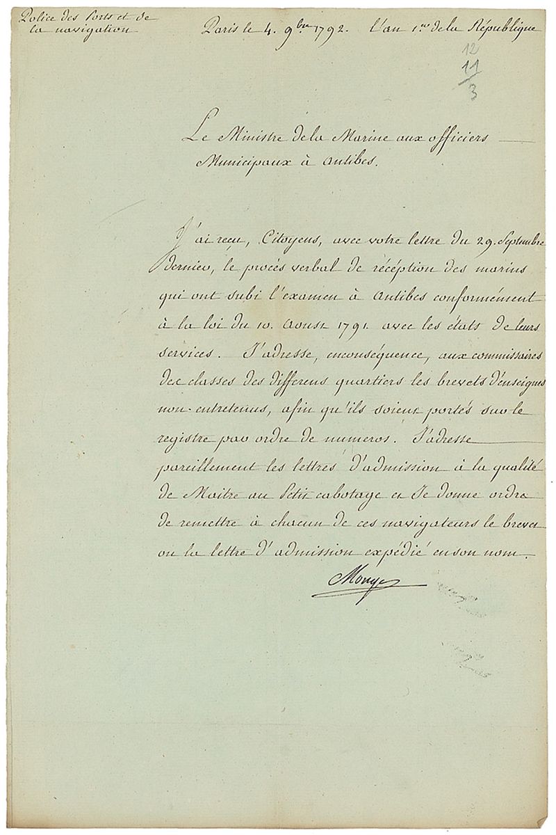 French mathematician (1746–1818) and the father of differential geometry. Manuscript LS, in French, signed “Monge,” one page, 8 x 12.25, October 4, 1792. An official letter concerning new officers, written during his tenure as Minister of the Navy of the French Republic. Intersecting folds, pencil notation to top, and some light soiling to lower right, otherwise fine condition.