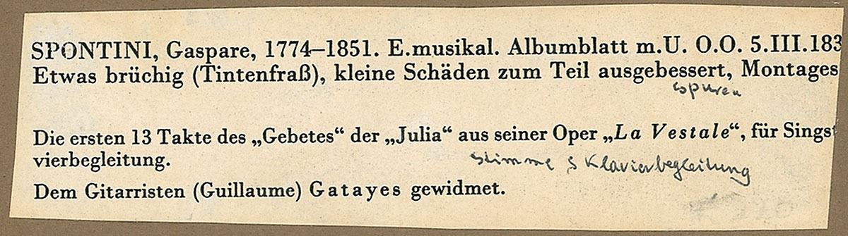 Italian opera composer and conductor (1774–1851), extremely celebrated in his time, though largely forgotten after his death. AMQS on a 6.5 x 8.75 off-white sheet, boldly inscribed at the bottom to guitarist Guillaume Gatayes, and signed “Spontini, 5 Mars 1831.” Spontini pens the first 13 detailed bars of "prayer" of the "Julia" from his opera "La vestale" for voice with piano accompaniment. In good to very good condition, with overall toning (heavier at top corners from adhesive residue on the reverse), several areas of paper loss from ink erosion, a few professional repairs to separations, and scattered edge chipping.
