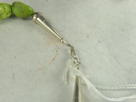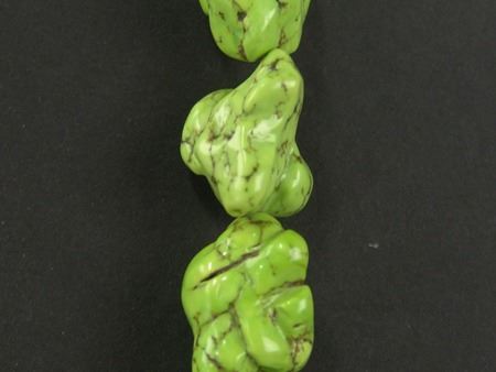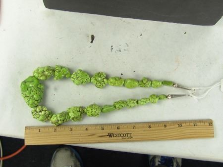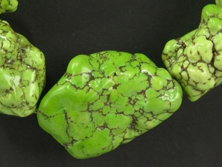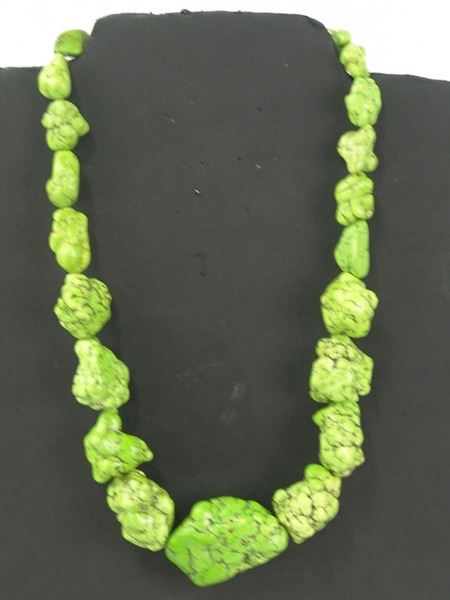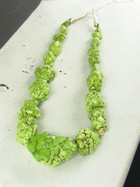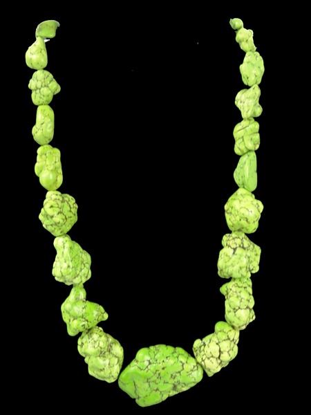 Late 1900s, Very colorful bright green necklace made from large softened gaspeite nuggets. Very good condition. 23" long
